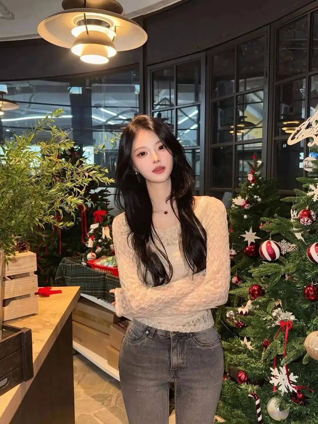 玛尔小花的穿搭核心是 “扬长避短,强化曲线”。她深谙韩系穿搭的精髓,从不盲目追求紧身设计,而是通过剪裁与版型勾勒完美比例。标志性的 X 型连衣裙是她的拿手单品,收腰放摆的设计精准贴合腰臀曲线,裙摆自然散开修饰胯部,搭配方领或 V 领设计凸显肩颈线条,让 S 曲线既明显又不失高级感。日常造型中,她常用短款针织上衣搭配高腰阔腿裤,上紧下松的组合既突出纤细腰身,又通过垂坠感面料平衡下半身比例,再踩一双尖头短靴,瞬间拉长腿部线条,将 “胸 - 腰 - 臀” 的黄金比例展现得淋漓尽致。