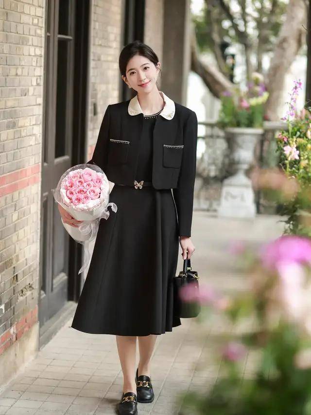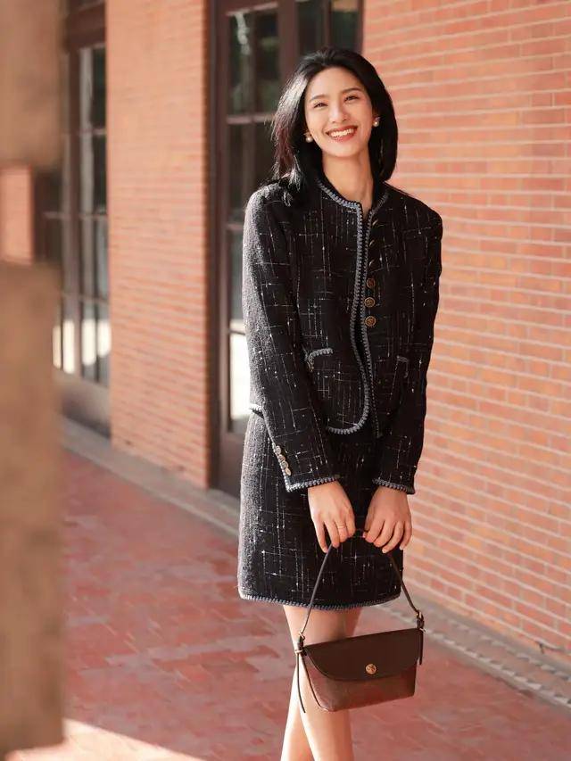 灰色小香风短外套+套装裙:小香风的精致与套装的简约结合,内搭白色半高领毛衣,脚踩黑色浅口鞋,不需要复杂配饰,就像“富家千金”的日常穿搭。