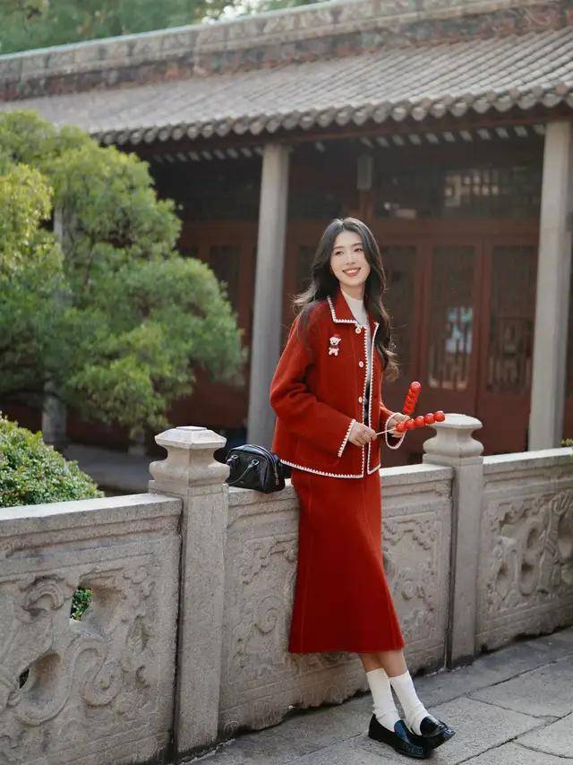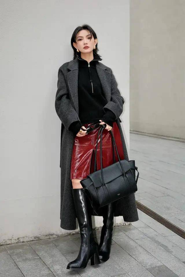 红色皮质短裙+灰色中长款大衣:经典红灰撞色自带复古滤镜,皮质裙的酷感中和大衣的端庄,内搭黑色高领打底,脚踩黑色中筒靴(鞋跟≤6cm),配黑色方正腋下包,整体造型“飒”与“美”兼顾,适合新年或约会。