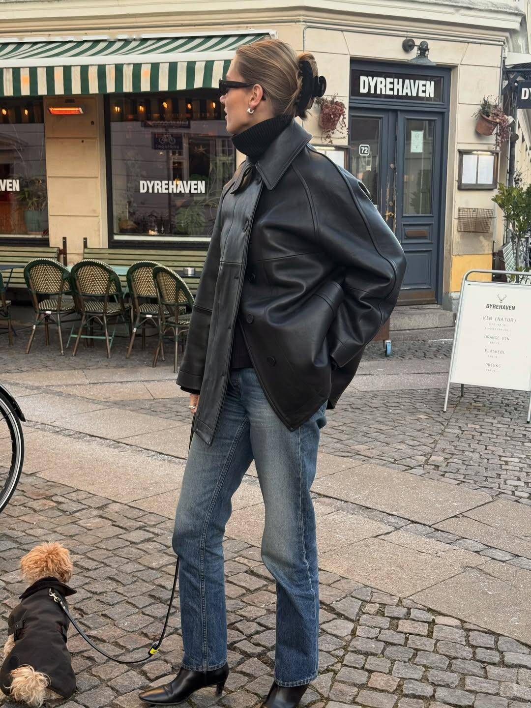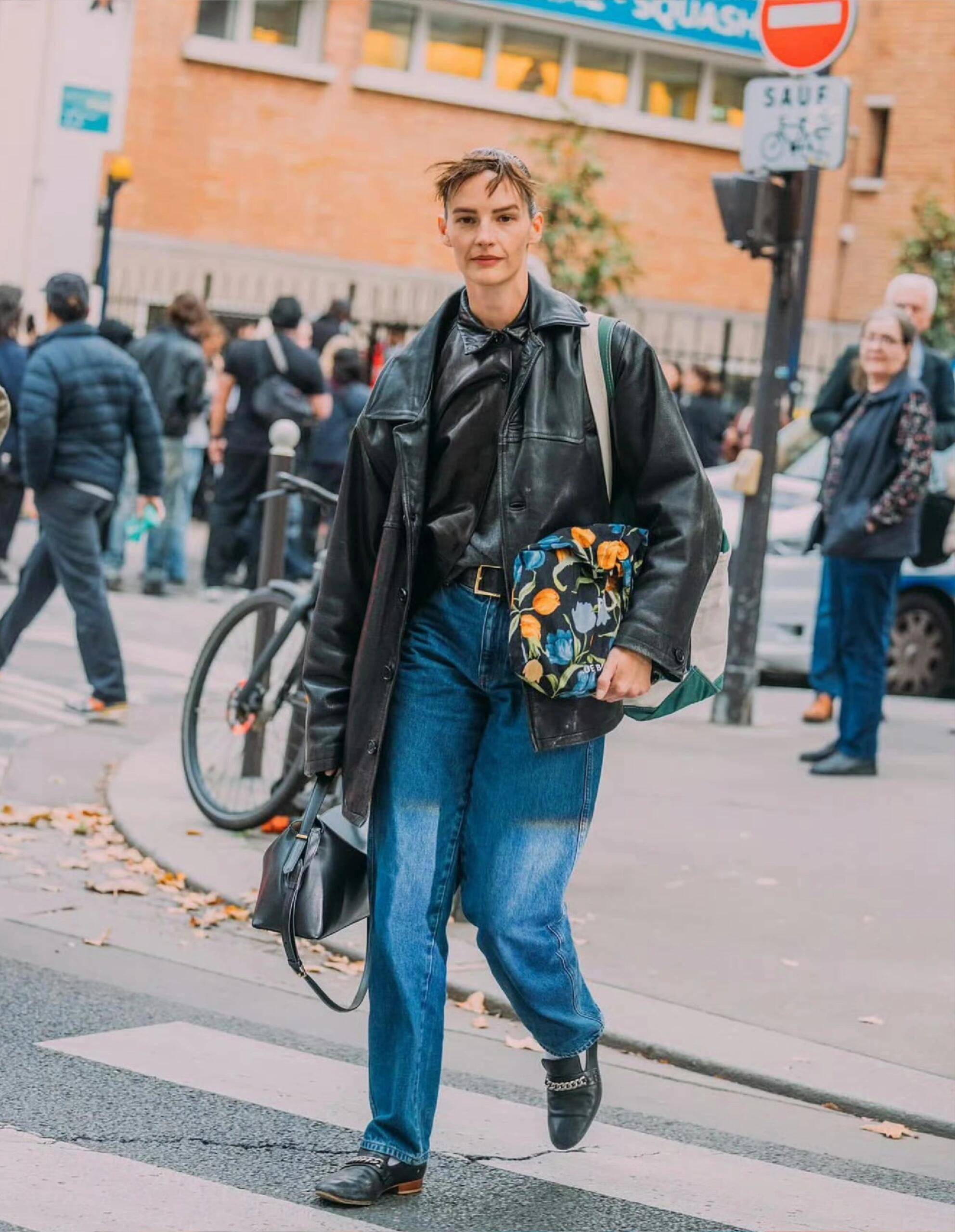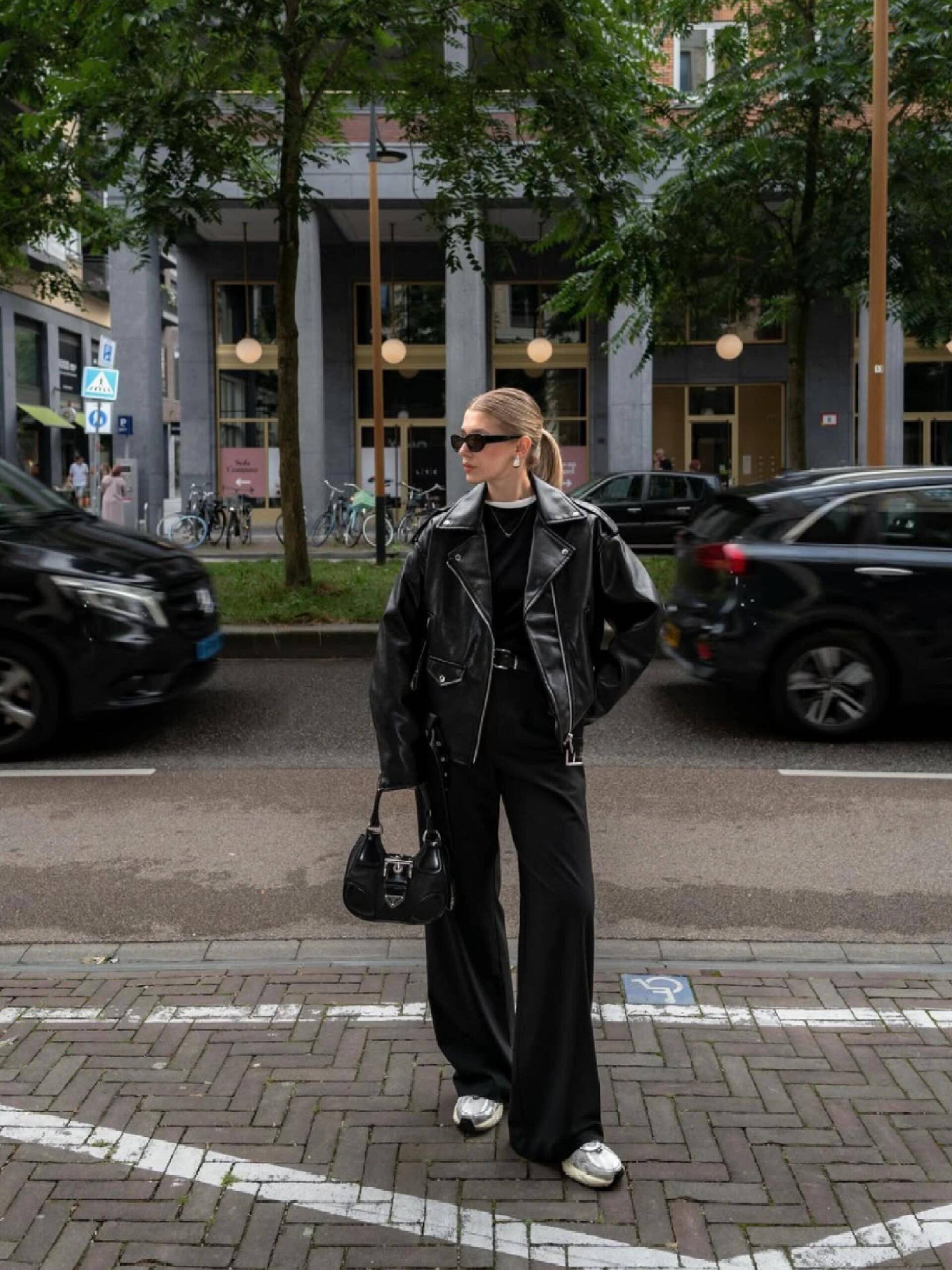 当然,穿搭的时候还少不了一款比较有品质的腋下包,这位博主用的是黑色的方包来点缀,让整体造型更上档次,显得又飒又美。