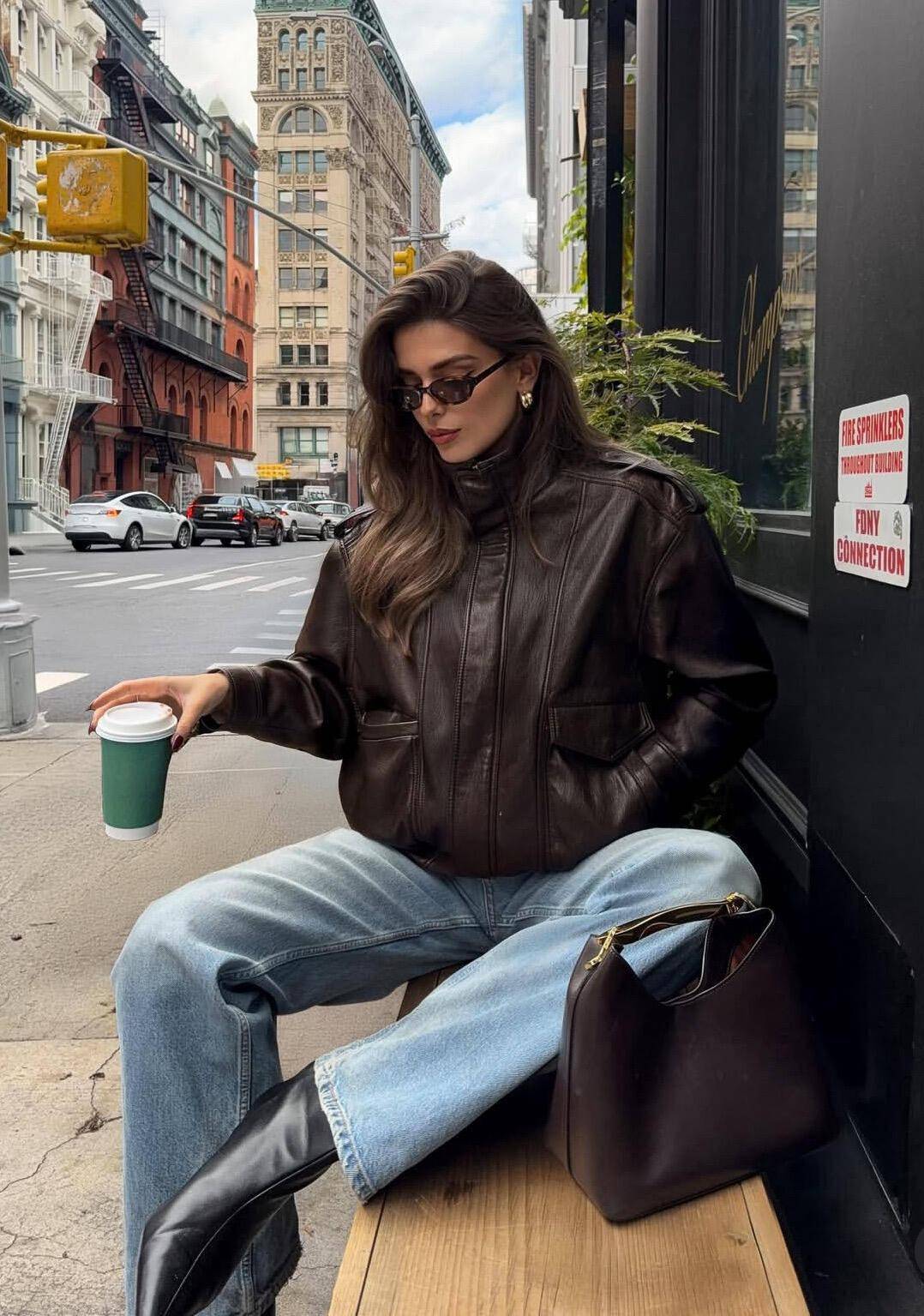 如果个子小巧的女生想让自己的穿衣打扮精致又洋气的情况下,直接选择短款的 X 型短大衣外套。例如上面这位时尚博主,就用大地色系的短外套搭配上黑色的伞装半身裙,脚上穿的一双马丁靴,内搭一条保暖的打底裤,这样就算冷风吹来也不会被冻着。