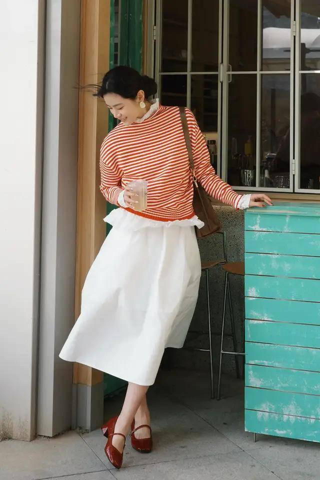 想让自己的打扮比较清清爽爽的情况下,推荐你可以选择白色的橙色开衫,内搭一件白色的 T 恤和一条白色的百褶半身裙,这样深色的搭配看起来清爽干净利落,谁穿谁好看。