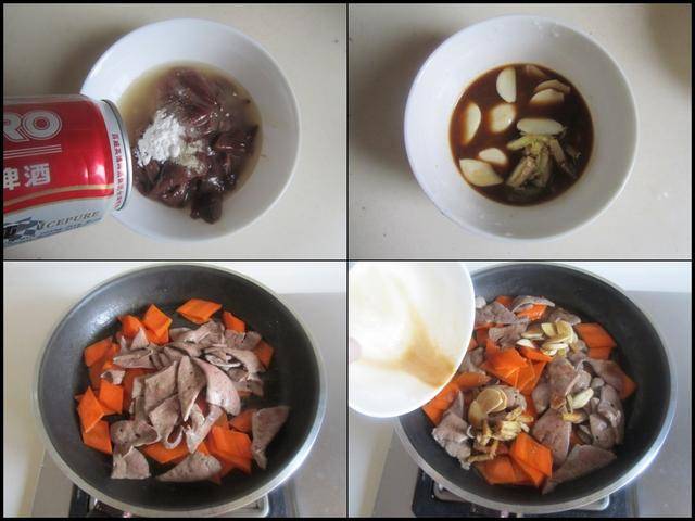 制作过程: 将胡萝卜去皮后切成片; 猪肝切成片冲洗干净后加入少许盐、淀粉、料酒、生抽和啤酒拌均匀腌制3分钟; 提前调制好小碗: 少许盐、生抽、淀粉、姜蒜片、水等调味料拌均匀。烧热锅放入少许油,加入胡萝卜片放进锅中翻炒几下, 再将腌制好的猪肝片放进锅中翻炒至微微变色,再倒入准备好的调味料汁放进锅中,翻炒均匀后焖煮两分钟以便入味,盛入钵中,撒上少许葱花即可。