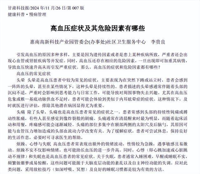 高血压症状及其危险因素有哪些 李贵良 甘肃科技报2024-11-26