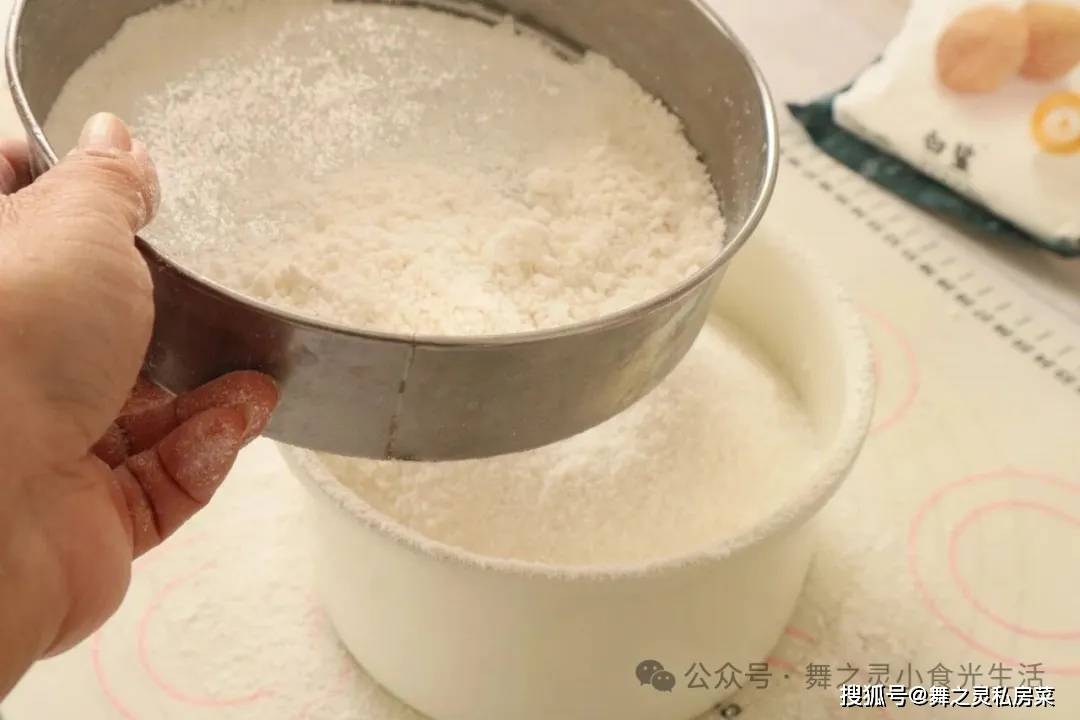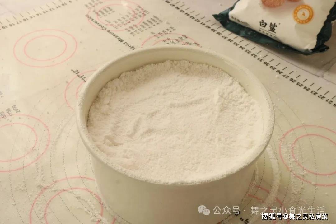 4、一次性可以将所有的粉都过筛好,然后将过筛过的粉盛一半出来放入模具中。