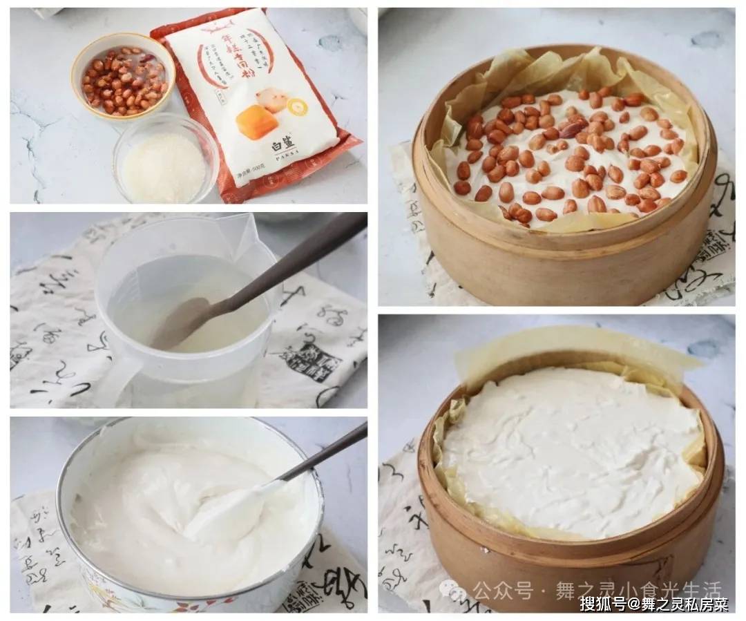 材料:年糕粉500克,温水400克,糖100克,花生适量提前浸泡2小勺左右