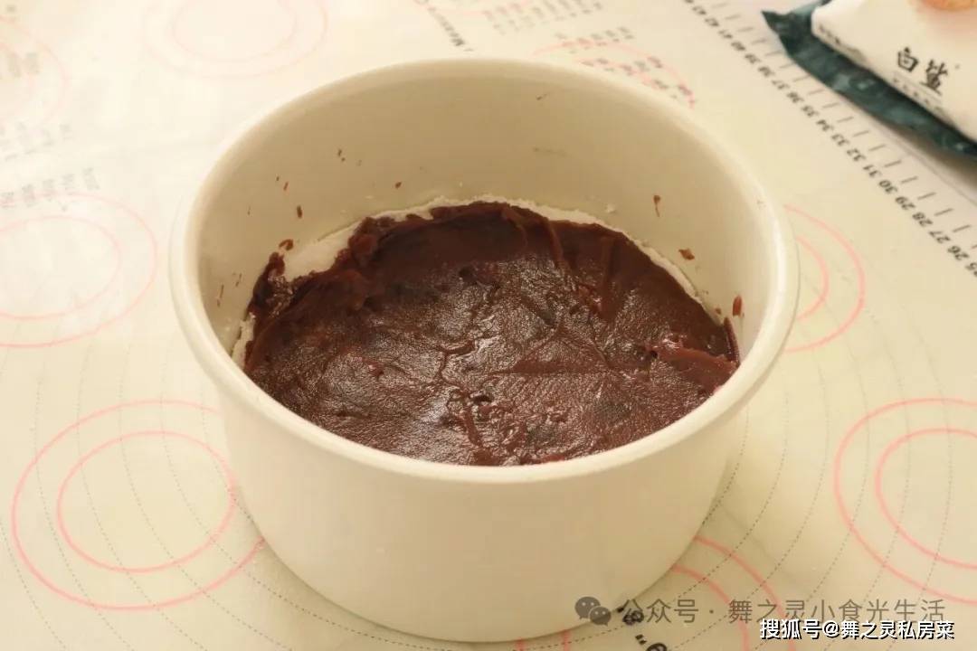 6、接着取出来,同时抹上一层豆沙,抹平(如果豆沙太干要加水搅拌开,要顺滑的状态而不是结实的豆沙)