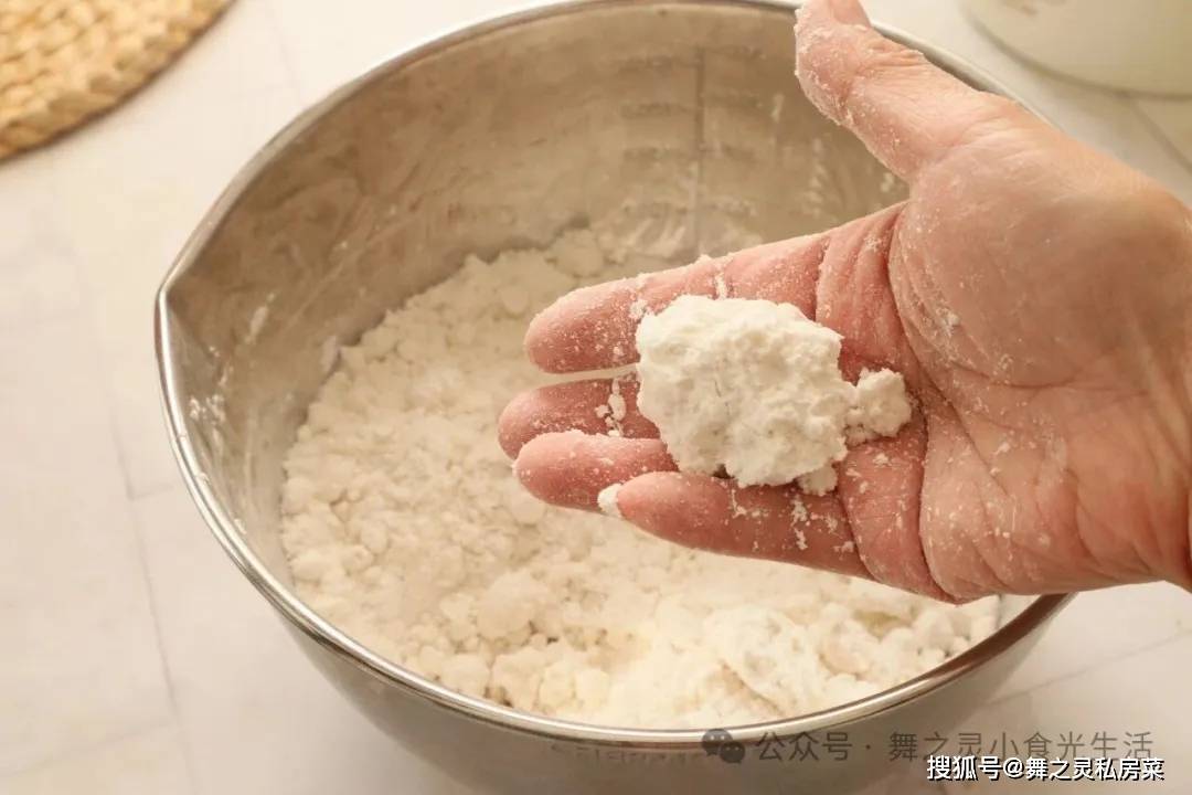 2、水量加入后的粉要呈现比较松散的状态,就是抓一下能成团,碰下能散开的样子。看看我这个状态就可以了。