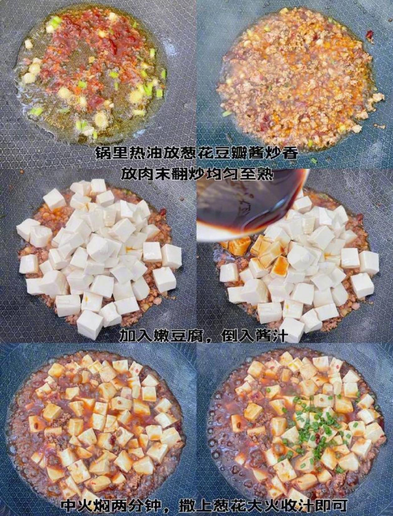 先从准备食材开始,这步是味道的底子。取一块新鲜的嫩豆腐,别选那种太硬的老豆腐,嫩豆腐的软嫩才是灵魂——切成2厘米见方的小块,泡在凉水里备用,这样能避免后续炒的时候碎得一塌糊涂。然后是肉馅,选三成肥七成瘦的猪肉,剁成细细的肉末,吃起来才会香而不柴;要是怕麻烦,直接买现成的肉馅也没问题,但记得提前处理:往肉馅里加半勺黑胡椒粉、一勺料酒、一勺生抽,用手抓匀,腌上10分钟,这步能去掉肉的腥气,还能让肉裹满底味。 接着调一碗“万能浇汁”,这是麻婆豆腐味儿正的关键。找个小碗,倒一勺生抽提鲜,半勺老抽上色(别放多了,不然豆腐会黑乎乎的),半勺盐、一勺淀粉,再兑上小半碗清水,用筷子搅到淀粉完全化开,这碗汁一下锅,豆腐就能裹满亮闪闪的酱色。 准备工作做完,开火炒菜才是重头戏。锅里倒两勺食用油,烧到六成热——就是把手放在锅上方能感觉到热气,但还没冒烟的程度,下葱花和一勺豆瓣酱,用铲子快速翻炒,豆瓣酱的红油会裹着葱香“滋啦”冒出来,香味能飘满整个屋子。这时候把腌好的肉末倒进去,大火快速翻炒,直到肉末变成浅棕色,颗粒都散开,别结块,不然吃起来会腻。 肉末炒香后,重头戏来了:把泡在水里的嫩豆腐捞出来,轻轻倒进锅里,千万别用铲子使劲翻,不然嫩豆腐会碎成渣——可以拿着锅柄轻轻晃动,让豆腐和肉末、酱料混在一起。然后把刚才调好的浇汁顺着锅边倒进去,汤汁会立刻裹在豆腐上,转成中火,盖上锅盖焖两分钟,这两分钟里别开盖,让热气把豆腐焖得饱饱的,每一块都吸满酱香。 焖到能闻到豆腐的软香时,掀开锅盖,撒上一把切碎的葱花,转大火快速收汁,这时候汤汁会变得稠稠的,裹在每一块豆腐和肉末上,亮闪闪的红油挂在豆腐边缘,用勺子轻轻舀起一勺,豆腐颤巍巍地晃,肉末粘在上面,香味直钻鼻子。 盛盘的时候,连汤带豆腐一起倒进碗里,筷子夹起一块豆腐,软得几乎夹不住,放进嘴里一抿就化,酱香裹着微微的辣,肉末的香混在豆腐的嫩里,连汤汁拌米饭都能吃两大碗。