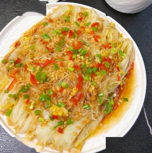 做法: 粉丝提前用温水泡软,剪成小段铺在盘子底部。娃娃菜切成竖长条,码在粉丝上。准备大量蒜蓉,分两次下油锅炸:先炸一半炸至金黄,再倒入另一半生蒜末和生抽、蚝油、少许糖、盐拌匀,调成“金银蒜”酱汁。把酱汁均匀淋在娃娃菜上。水开上锅,大火蒸10分钟,出锅撒点红椒粒装饰。