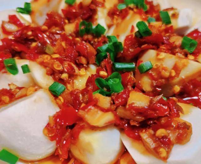 做法: 选用荔浦芋头,去皮洗净切成厚片。找一个深盘,将芋头片一片片码好。准备剁椒,如果喜欢蒜味可以加点蒜末,少许豆豉,加一点点生抽和油搅拌均匀(剁椒本身咸,盐就不用放了)。将调好的剁椒酱铺在芋头上。水开上锅,蒸15到20分钟,直到芋头用筷子能轻松扎透。