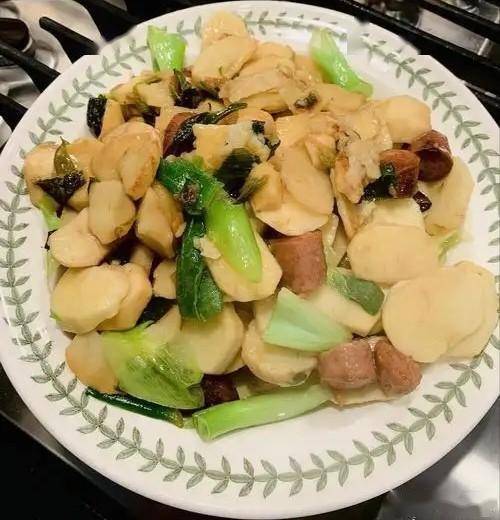 3、放入慈姑片大火快速翻炒2分钟,沿锅边淋少许清水防干柴,炒至表面微微透明、边缘发脆。