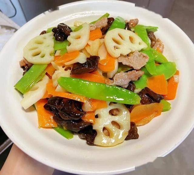 1.莲藕去皮,切成薄片,放进清水中浸泡10分钟,防止氧化变黑;荷兰豆去筋,洗干净;胡萝卜去皮,切成薄片;木耳用温水泡发,洗干净撕成小朵。
