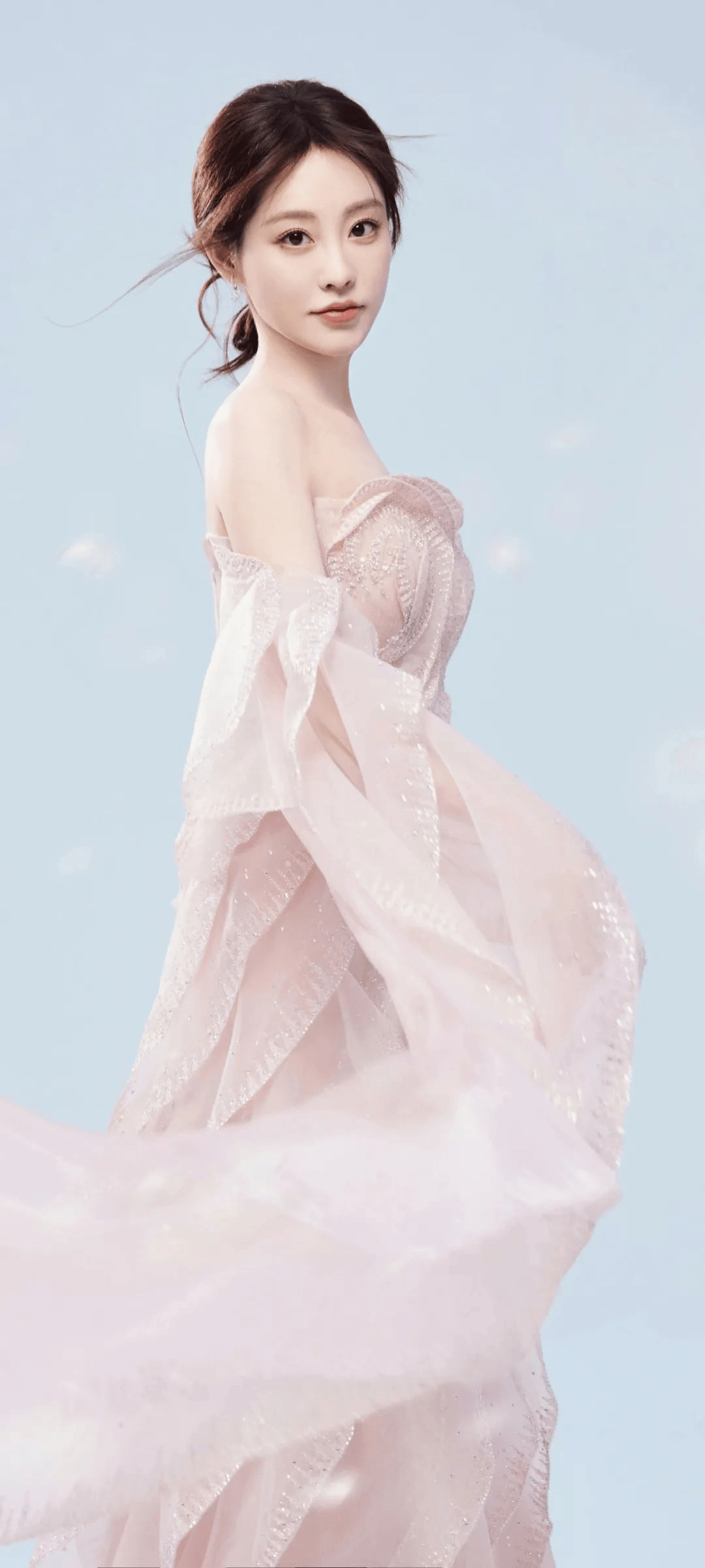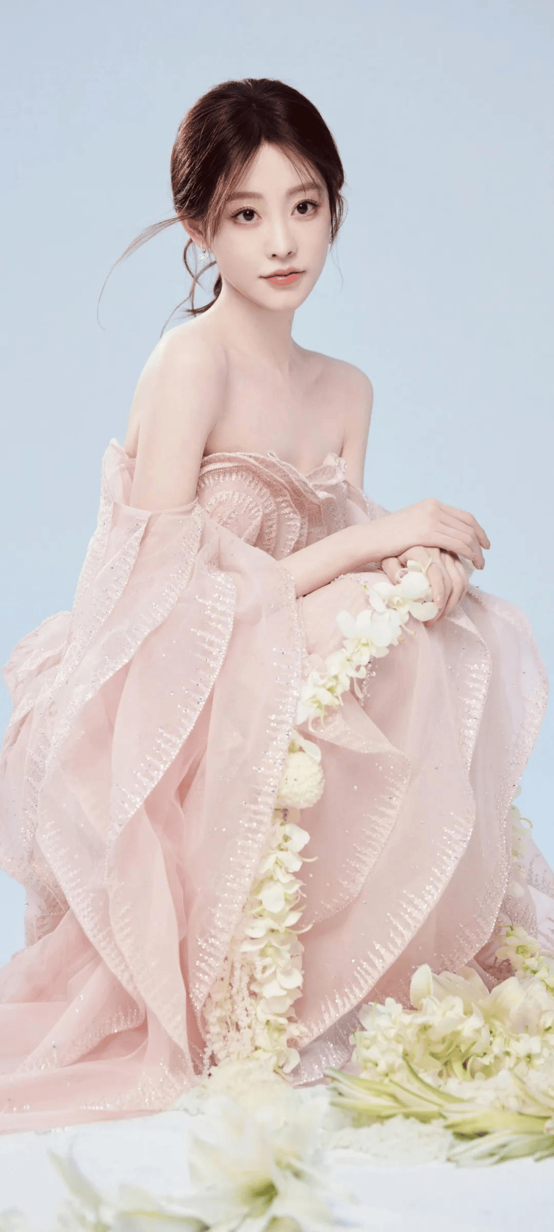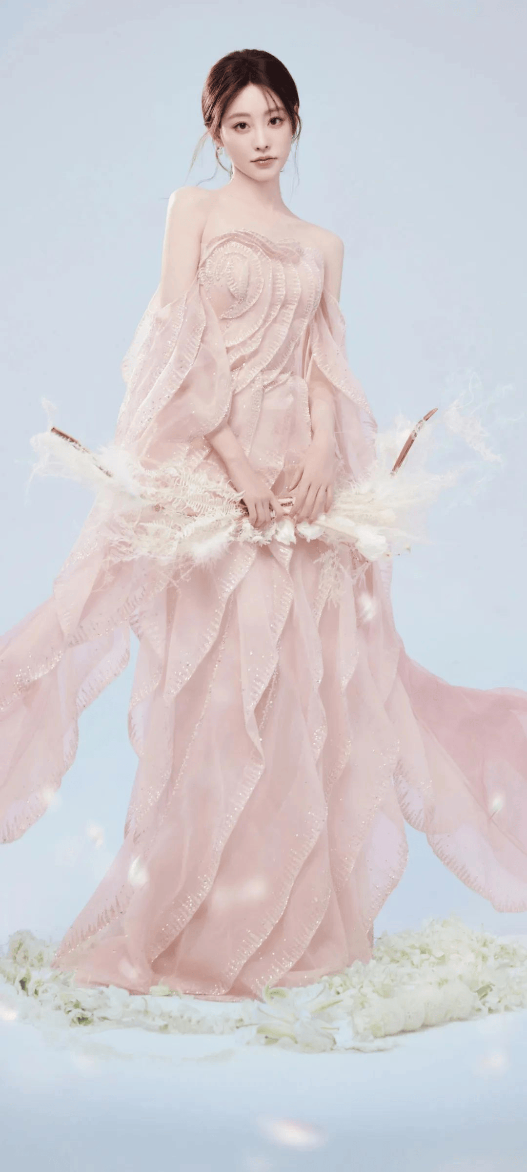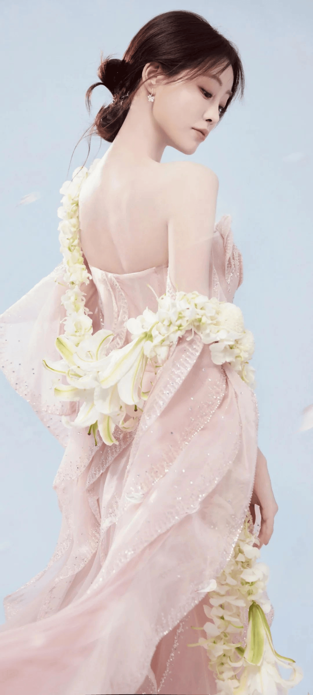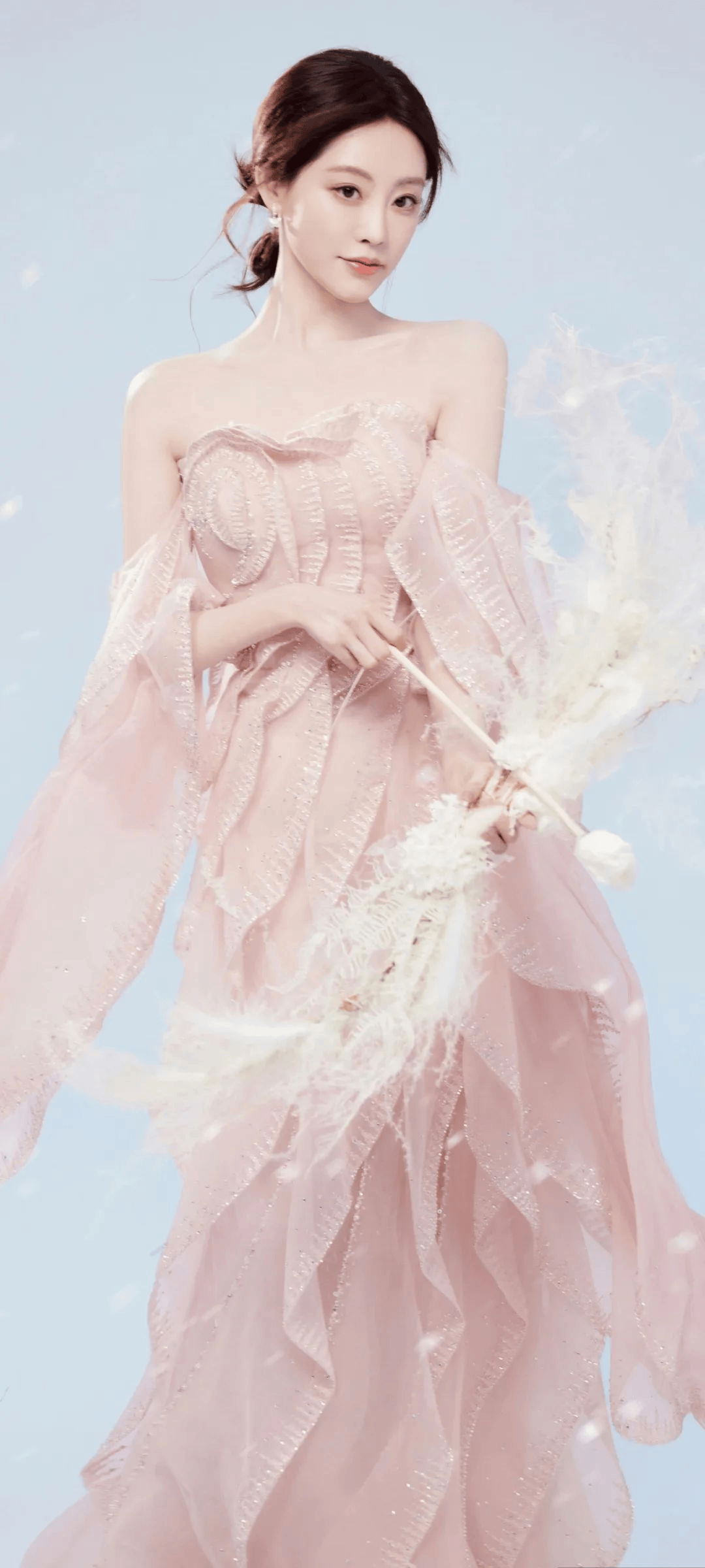 那身粉嫩花瓣长裙之所以被她驾驭得如此出彩,离不开她纤细挺拔的身姿和清冷中带着甜美的气质。她不需要过多装饰,只需静静站在那儿,便自成一道风景,所谓“绝色”,大概便是这种经得起各种镜头挑剔的美。