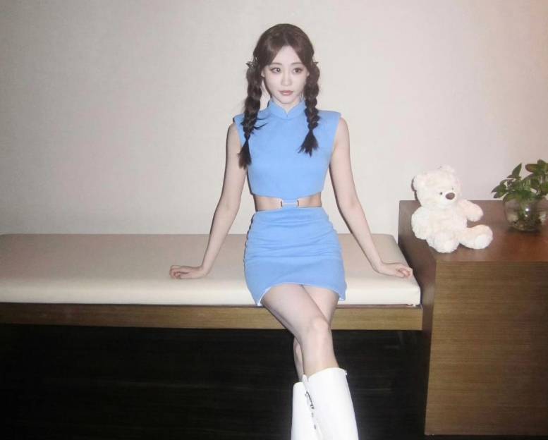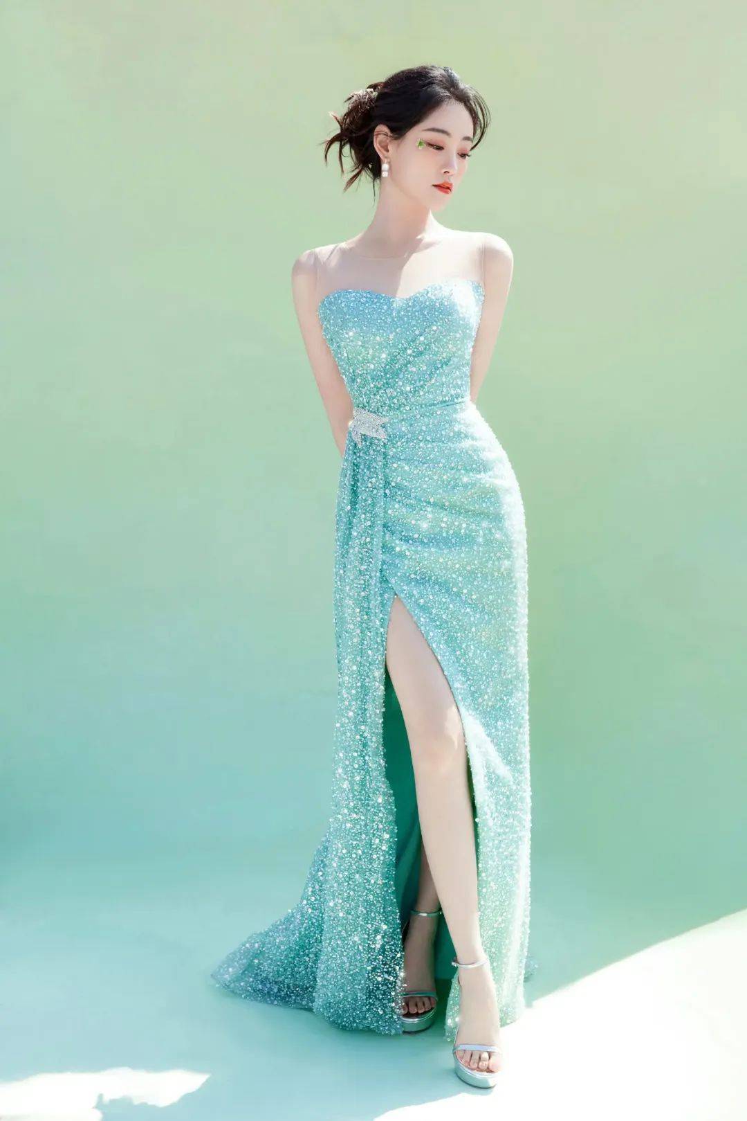要说这裙子选得有多绝?简直是把 “时尚教科书” 四个字焊在了身上!浅蓝配色像刚从马尔代夫捞上来的海水,清新到能让夏天提前半个月报到,显白效果更是离谱 —— 连现场打光师都得默默调低亮度,生怕被她的肤色抢了风头。紧身剪裁精准得像用 3D 扫描仪量身后定制,从腰到臀的 S 曲线流畅得比数学课本里的正弦函数还完美,裙摆长度卡在脚踝上方一厘米的黄金位置,把纤细的小腿线条露得恰到好处。更绝的是面料那点微弹质感,连她走路时裙摆的弧度都像经过精密计算,每一步都在 “偷偷” 加分。