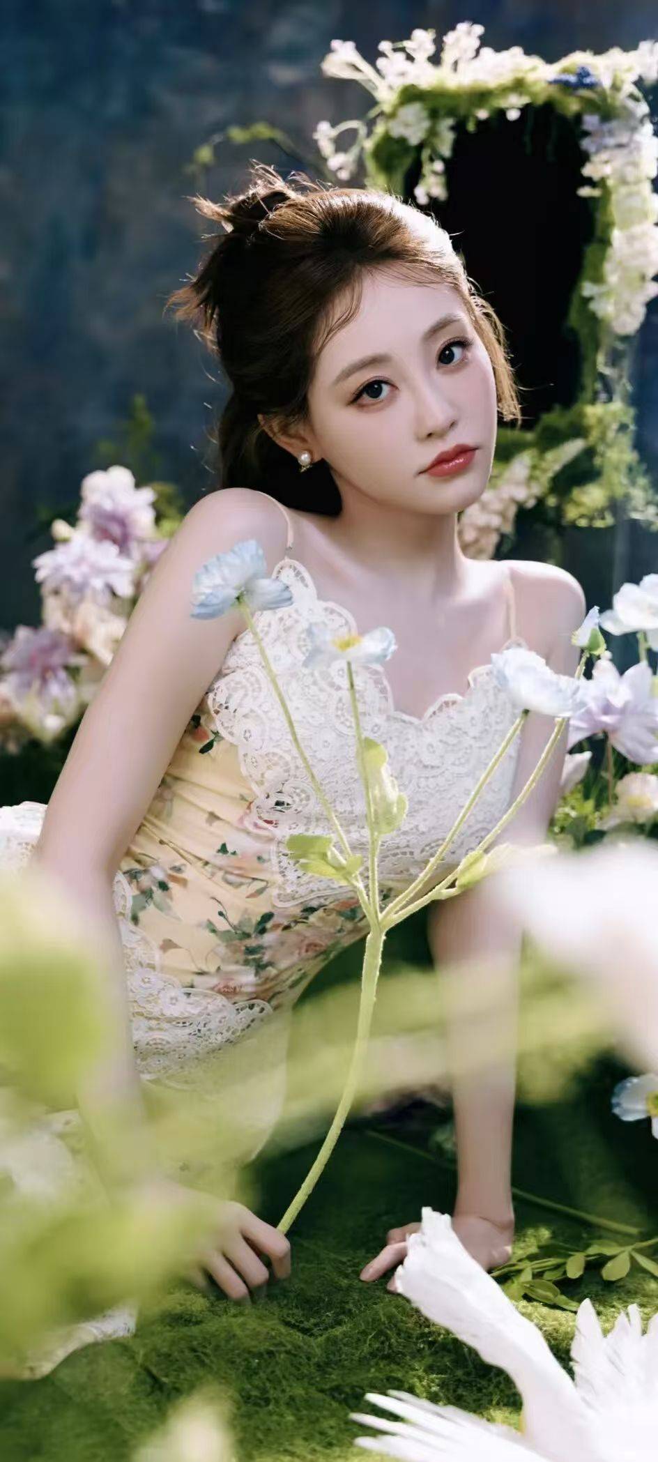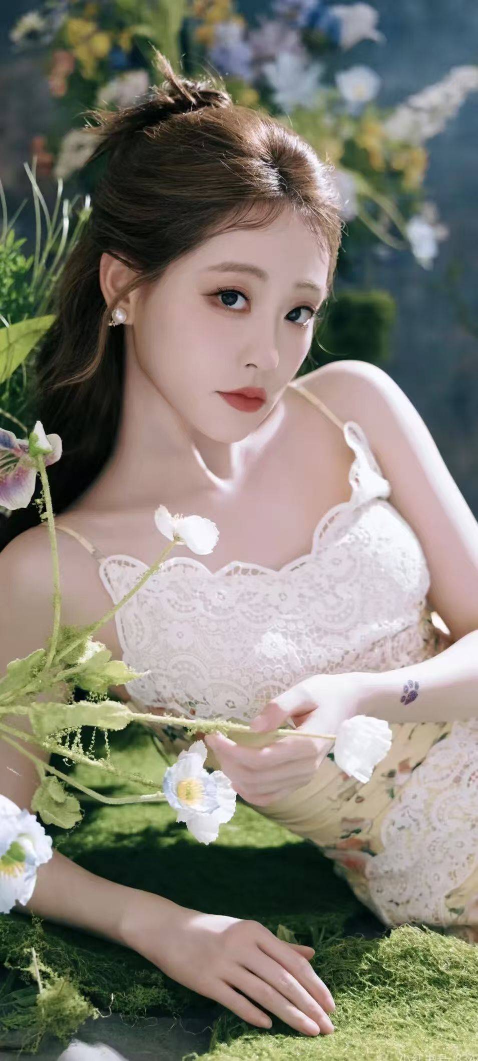 最绝的是她和花的互动——要么伸手轻轻捏着一朵白色小花,要么侧着头让发丝和花瓣蹭在一起,连指尖都透着小心翼翼的温柔。她的皮肤白得像刚挤出来的牛奶,和裙子的鹅黄色一搭,整个人都在发光。你看她趴在绿色苔藓上的样子,眼神清澈得像山泉水,嘴角微微上扬,像是在和花丛里的小精灵说悄悄话。