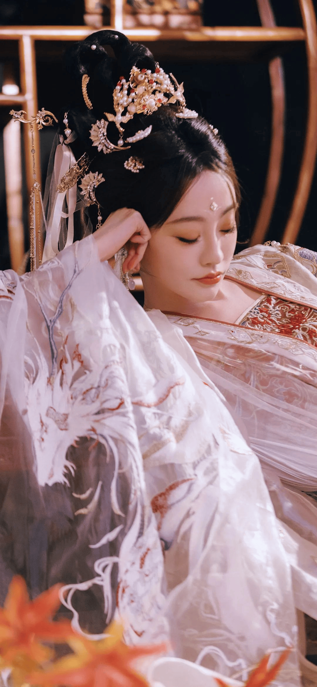 祝绪丹穿着杏色薄纱裙卧在芍药丛中,发间簪着的珍珠步摇随呼吸轻轻颤动。当她把脸颊贴向花瓣时,那种"人面桃花相映红"的古典美,让人恍觉是工笔画里的花神偷渡到了人间——这位中戏毕业的姑娘,总能把现代镜头拍出唐宋词牌的韵律。