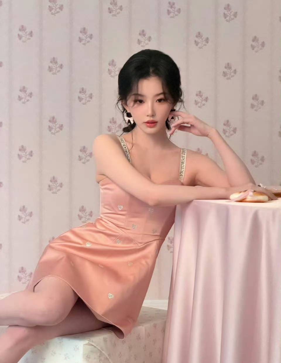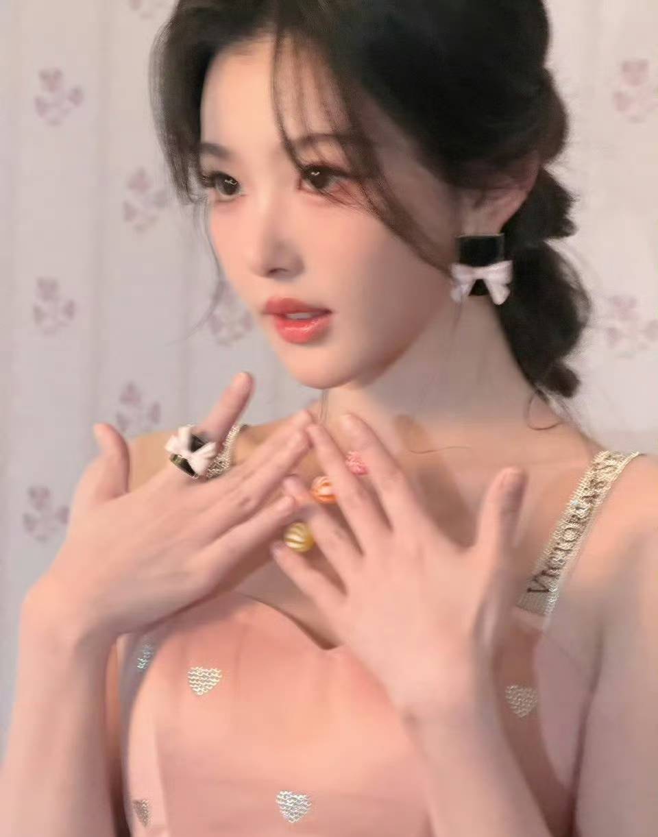 照片里的孔雪儿,仿佛是从童话世界中走出的甜心公主,却又带着一丝恰到好处的成熟韵味。粉色的短裙轻盈飘逸,巧妙地衬托出她白皙透亮的肌肤,宛如一块刚刚出炉、散发着诱人香气的小蛋糕。裙子上的钻石爱心点缀,在光影的映衬下闪烁着细碎的光芒,为整体造型增添了几分精致与华丽。而她那一头慵懒的卷发,随意地披散在肩头,随着动作轻轻晃动,更添几分随性与妩媚。