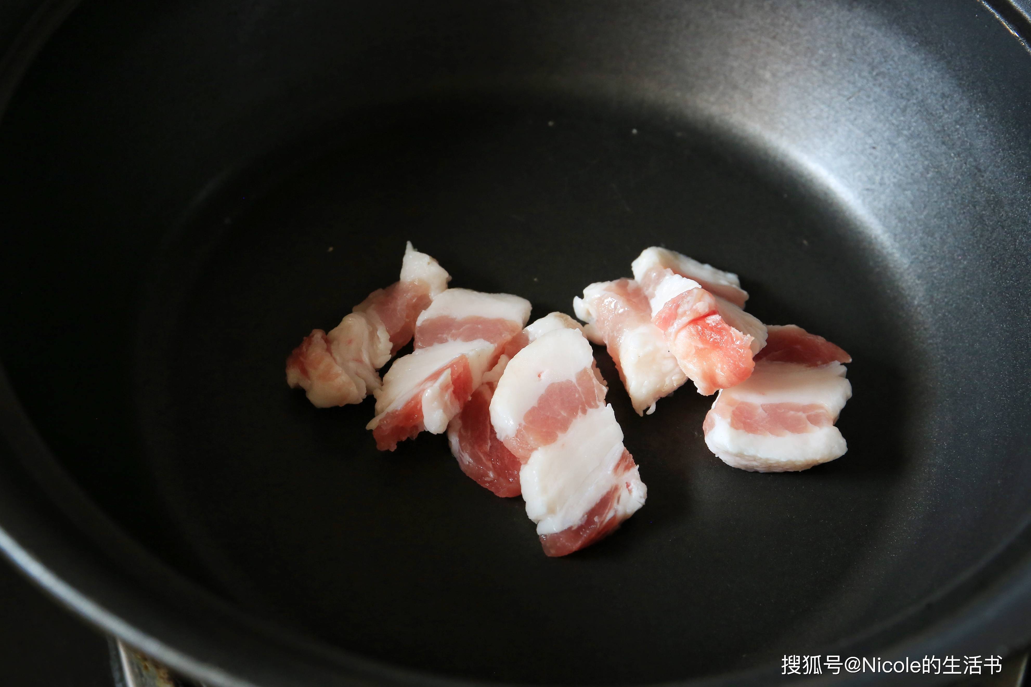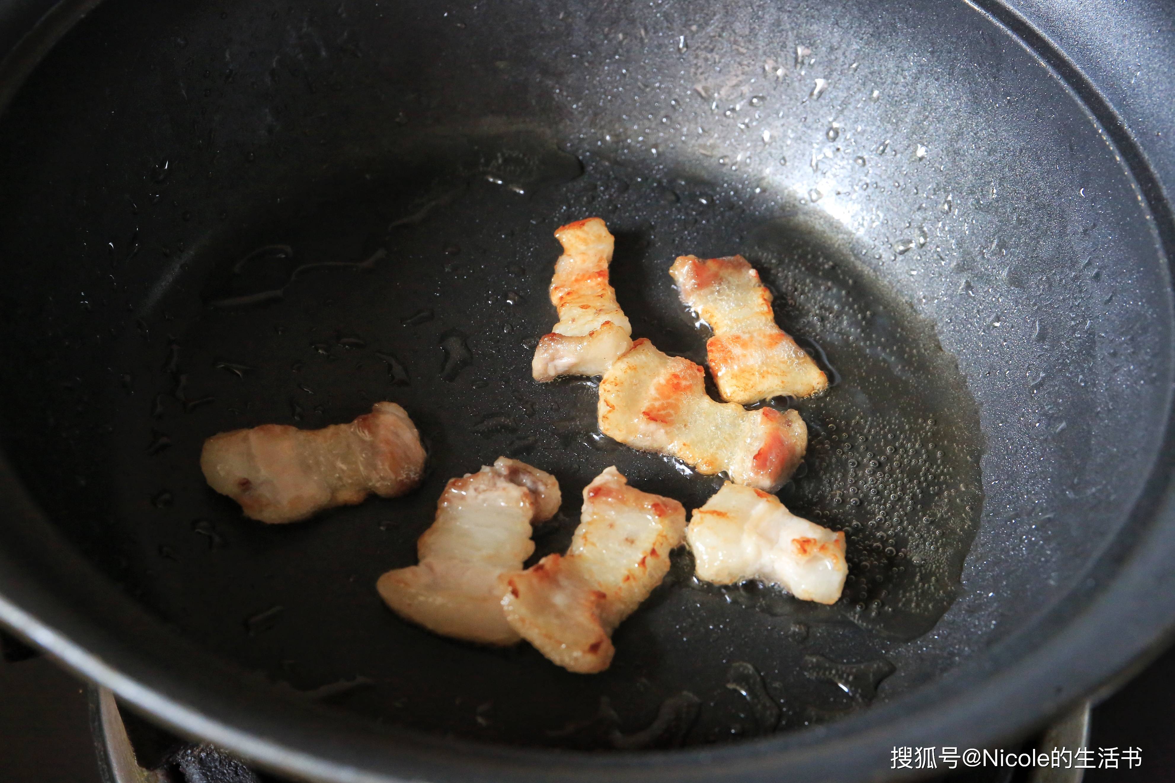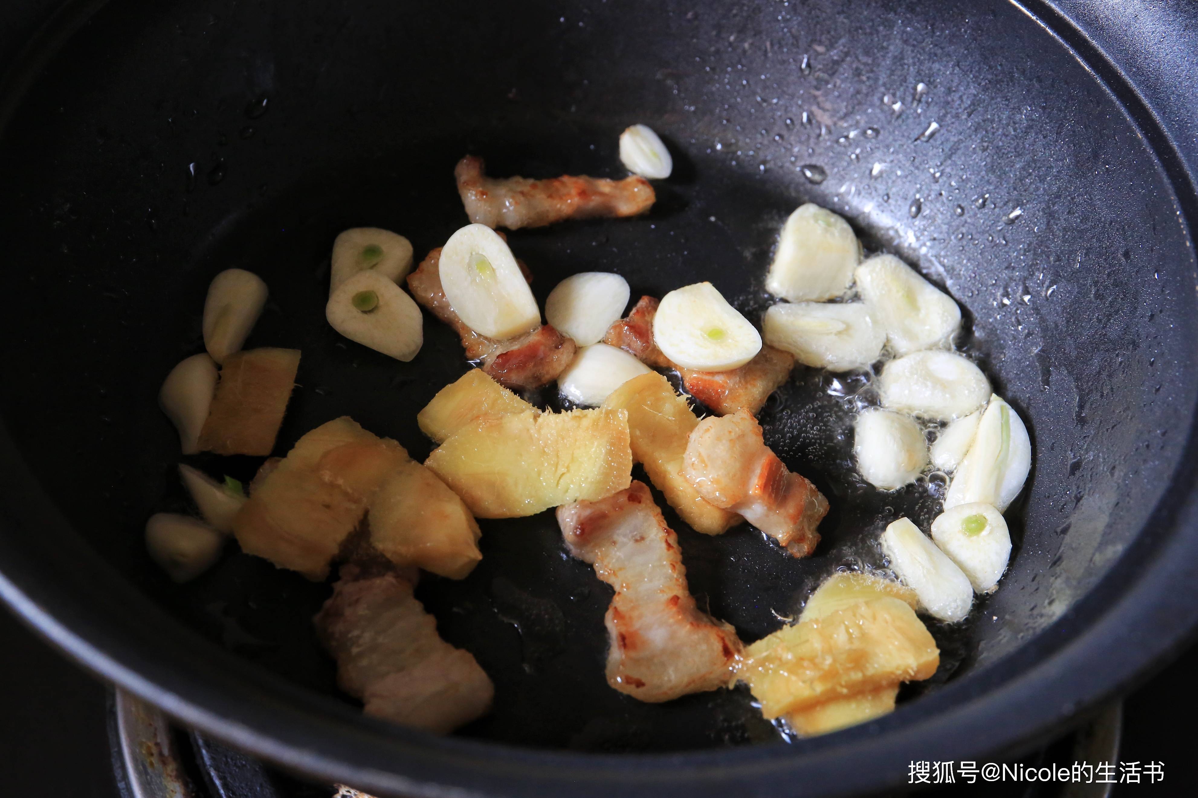 2. 锅中不放油,煸炒五花肉至出油,加入姜蒜片爆香。
