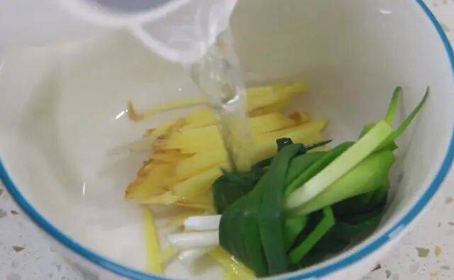 2,准备一块香葱,两片姜,抓一点葱姜水;