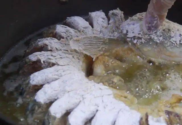 4. 腌制好的鱼裹上淀粉,油温七成热时下锅炸至两面金黄,捞出备用。