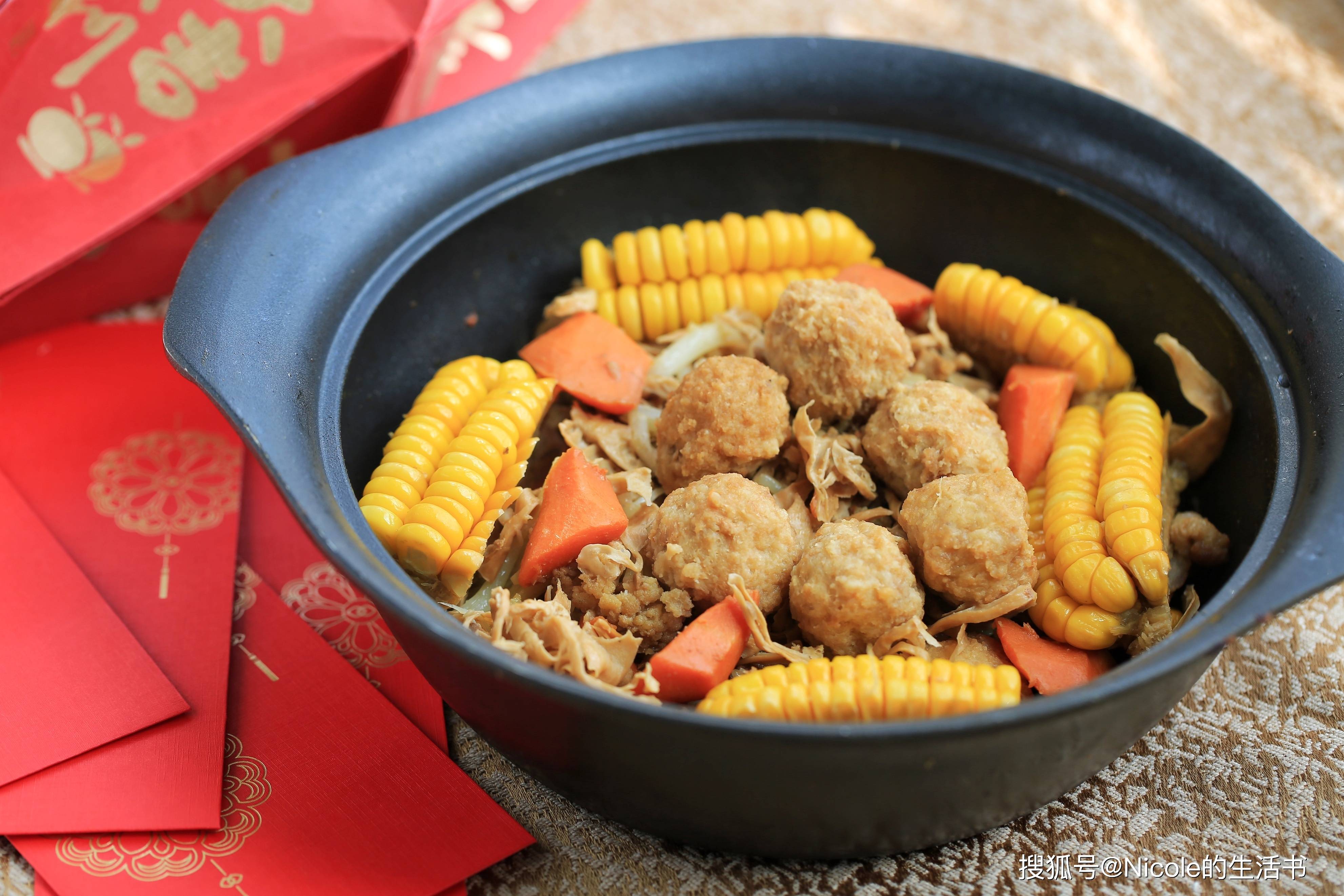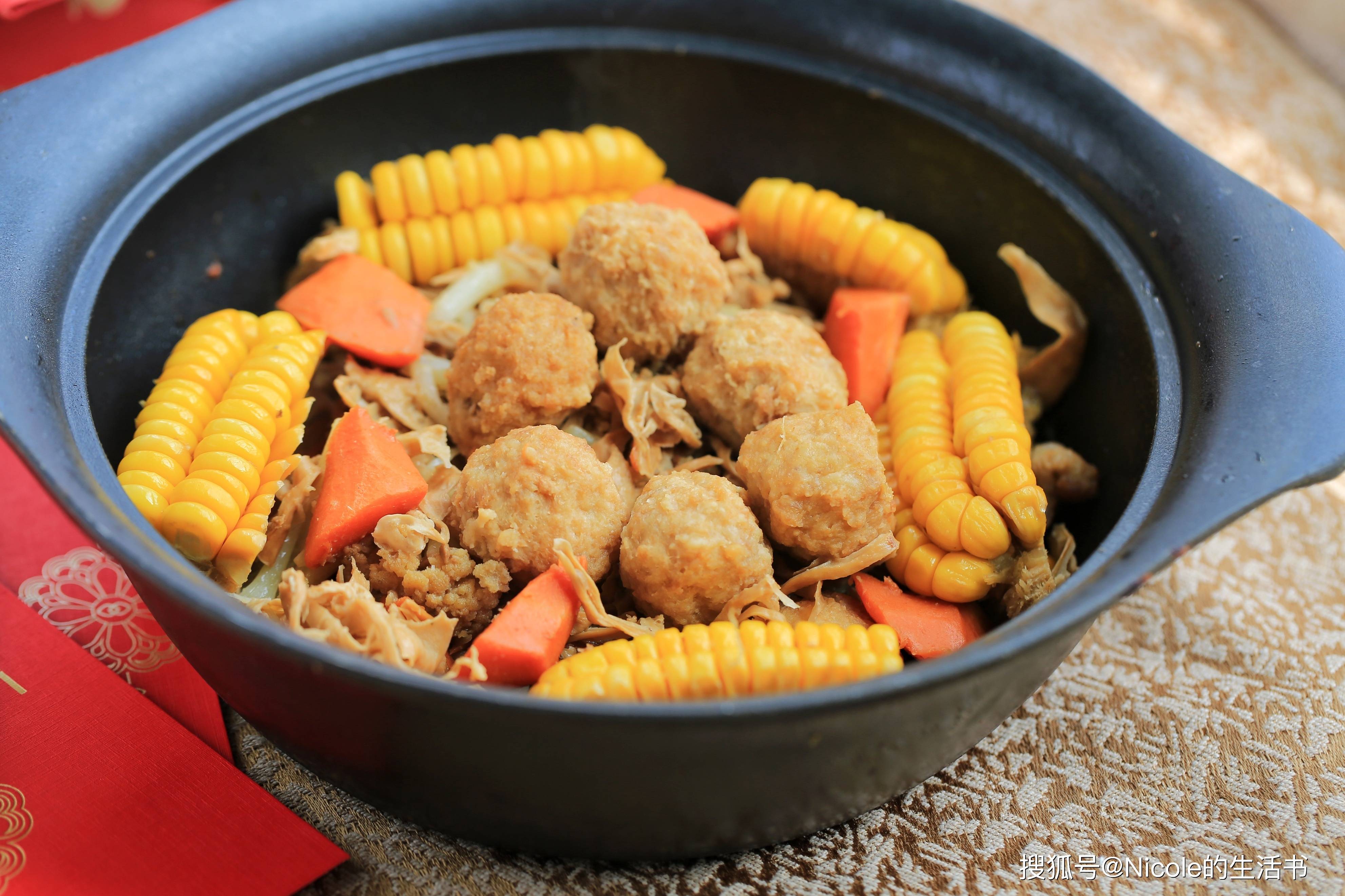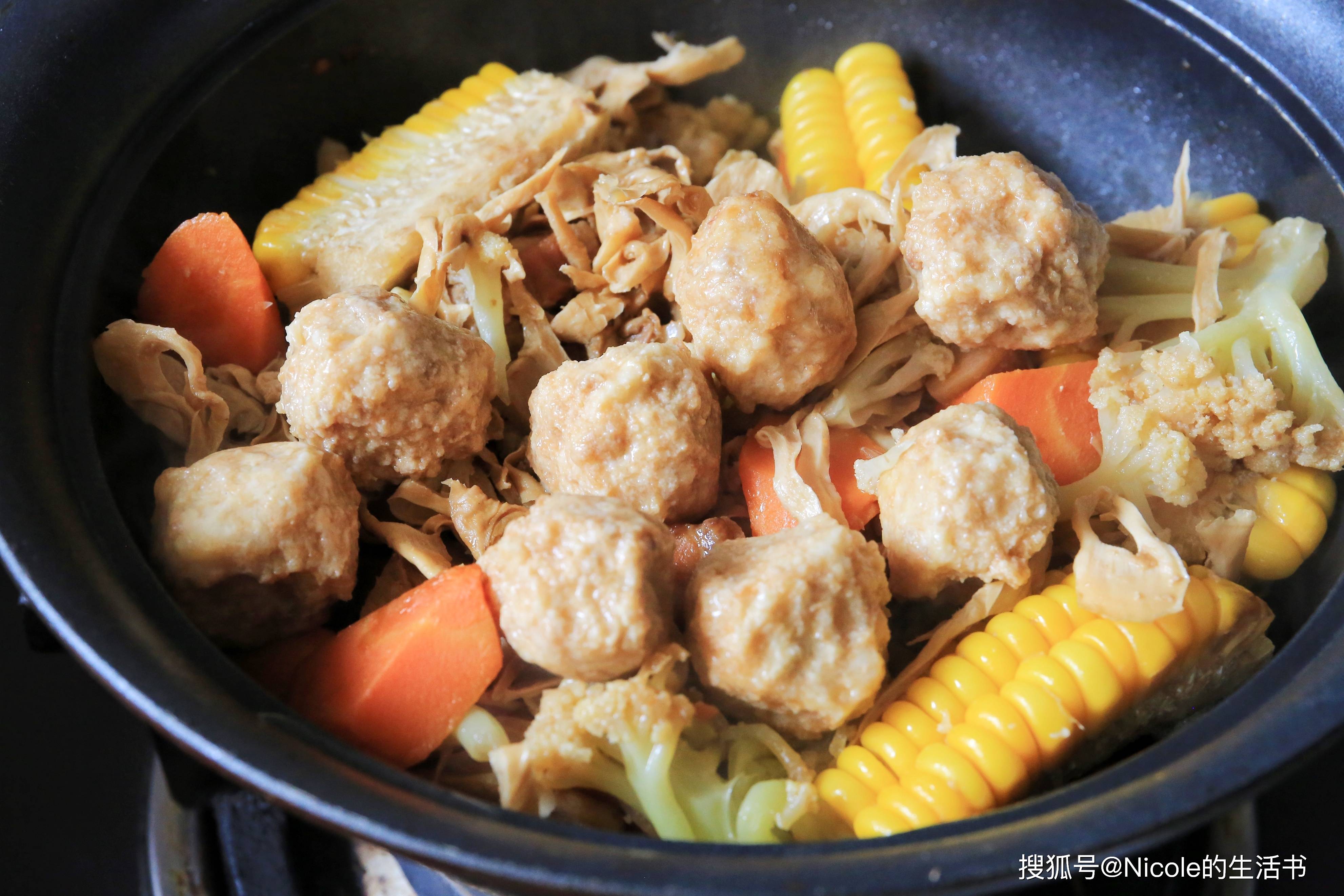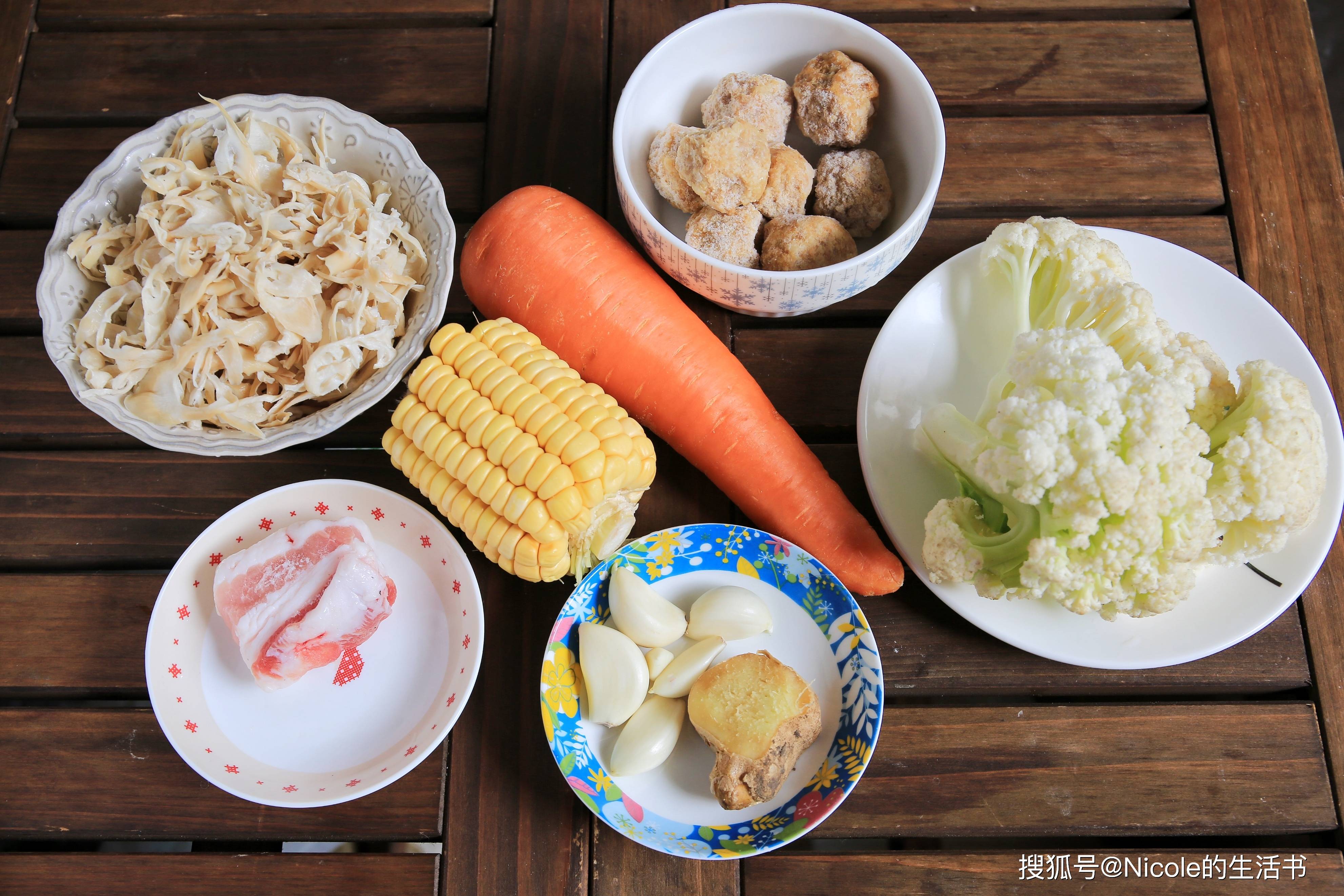 主料:五花肉100g、炸丸子8个、菜花2朵、笋干少许、胡萝卜1根、玉米1/2根