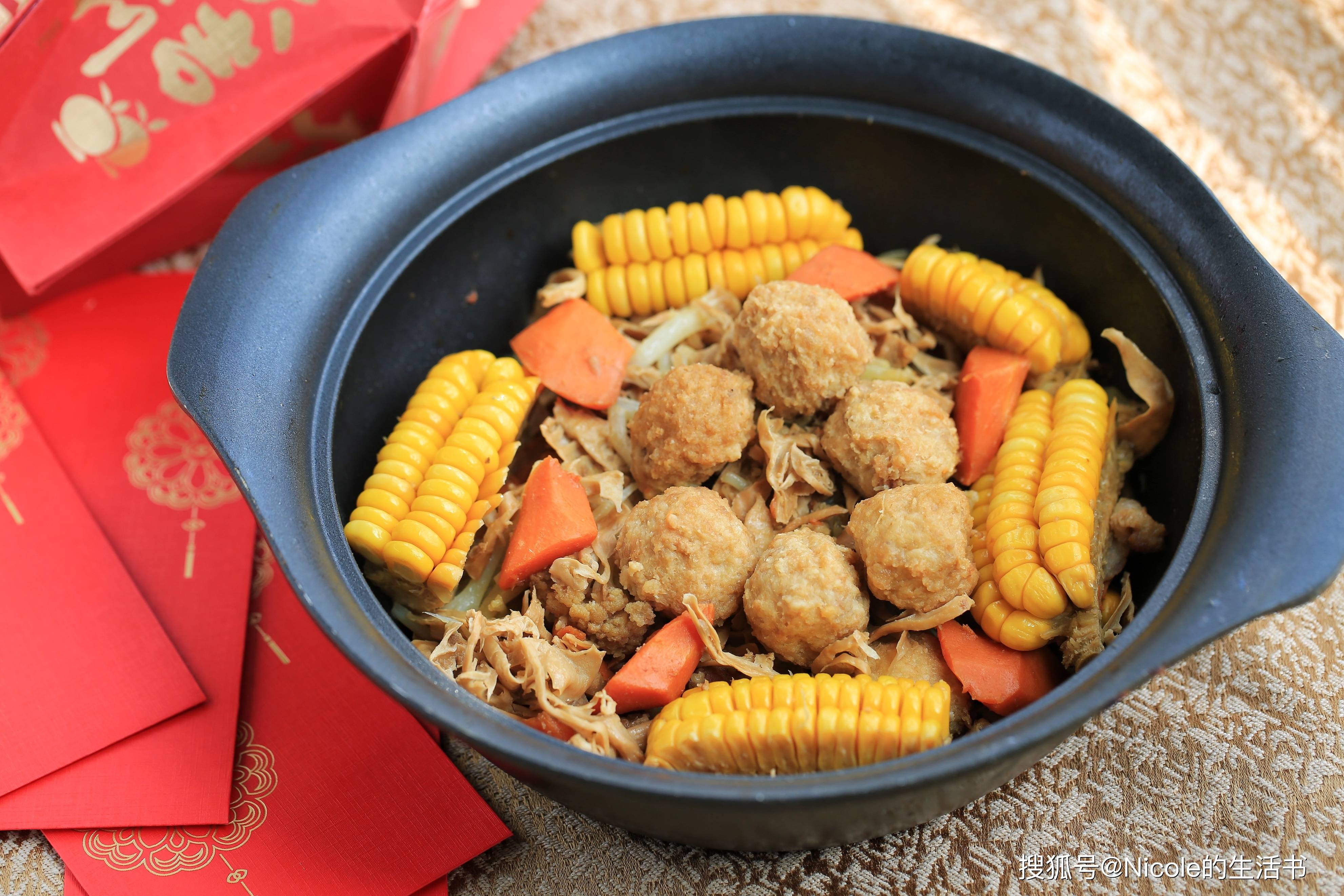 五花肉的醇厚、炸丸子的酥香,搭配菜花的清甜、笋干的鲜爽,再辅以胡萝卜的红润、玉米的金黄,红、黄、白、绿交织,恰似新年里五彩斑斓的喜庆光景。豆瓣酱的酱香是这道菜的灵魂,醇厚浓郁的酱汁裹着每一种食材,慢炖之下,肉香与菜香相互渗透,每一口都是层次丰富的滋味,正如一家人围坐一桌,凑成了最温暖的团圆。