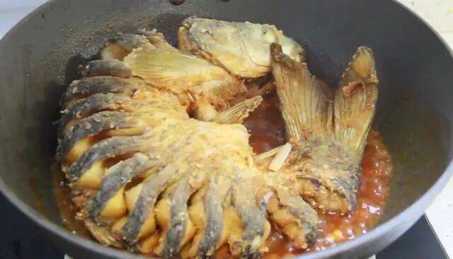 加生抽、老抽、白糖、少许醋,烧开后转小火焖煮15分钟,中途用勺淋汤汁在鱼身上。