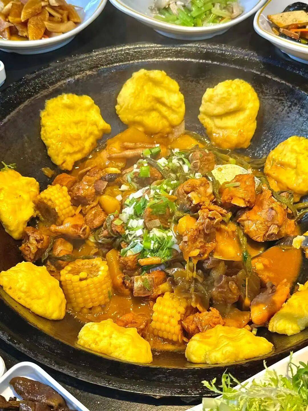 在阿尔山的冬日,没有什么比一锅铁锅炖更治愈。选用山林间散养的笨鸡,肉质紧实有嚼劲,搭配粉条、土豆、白菜,一同放进厚重的铁锅中,加入秘制酱料慢炖。柴火在锅底燃烧,铁锅咕嘟作响,汤汁逐渐浓稠,鸡肉的鲜香与蔬菜的清甜相互渗透,香气顺着锅盖的缝隙溢出,勾得人食指大动。炖好后,掀开锅盖,热气扑面而来,鸡肉软烂脱骨,粉条吸饱汤汁软糯入味,土豆绵密香甜,用铁锅贴着锅边的玉米饼蘸着汤汁吃,焦香软糯,满口都是东北烟火的温暖滋味。