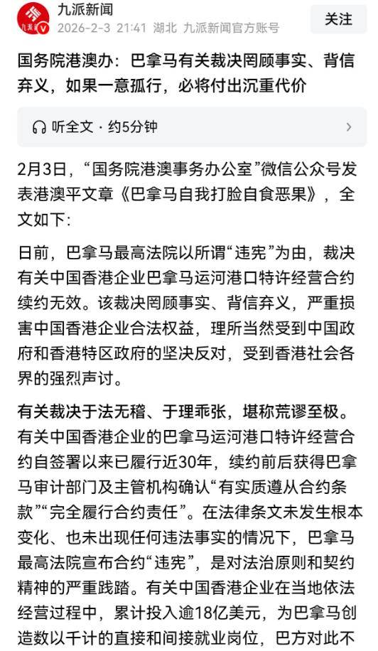 更为严厉的是,港澳办发出重磅警告,称巴拿马的裁决罔顾事实、背信弃义,明确表示这是给巴拿马的最后改错机会,这种严厉的措辞,足见中方对此事的重视与维权的决心。
