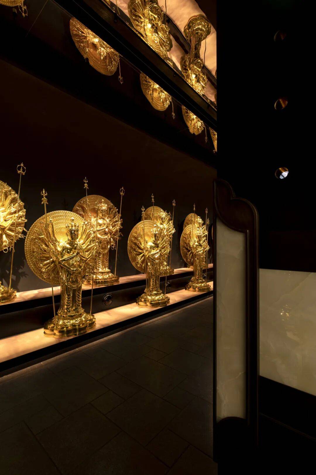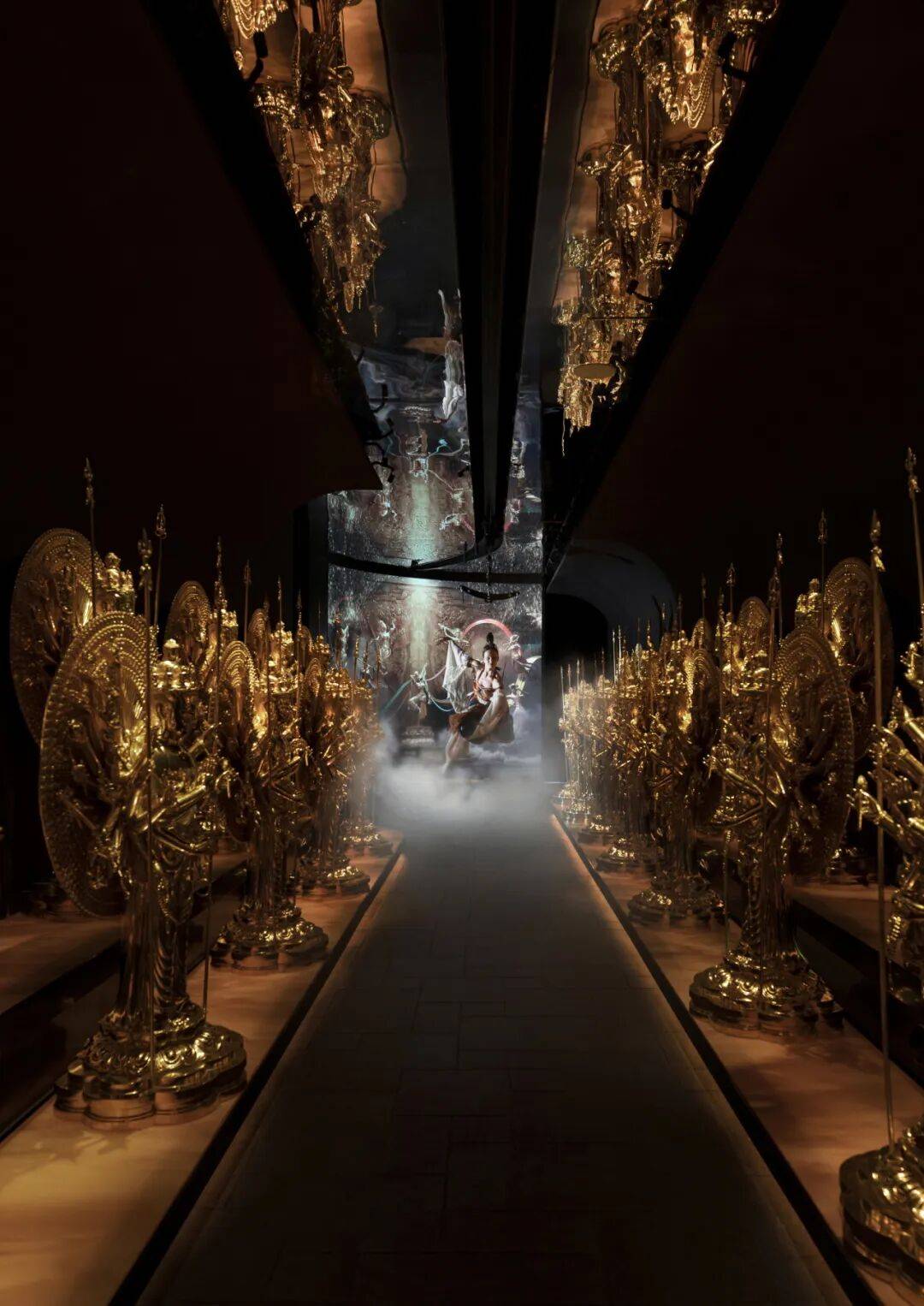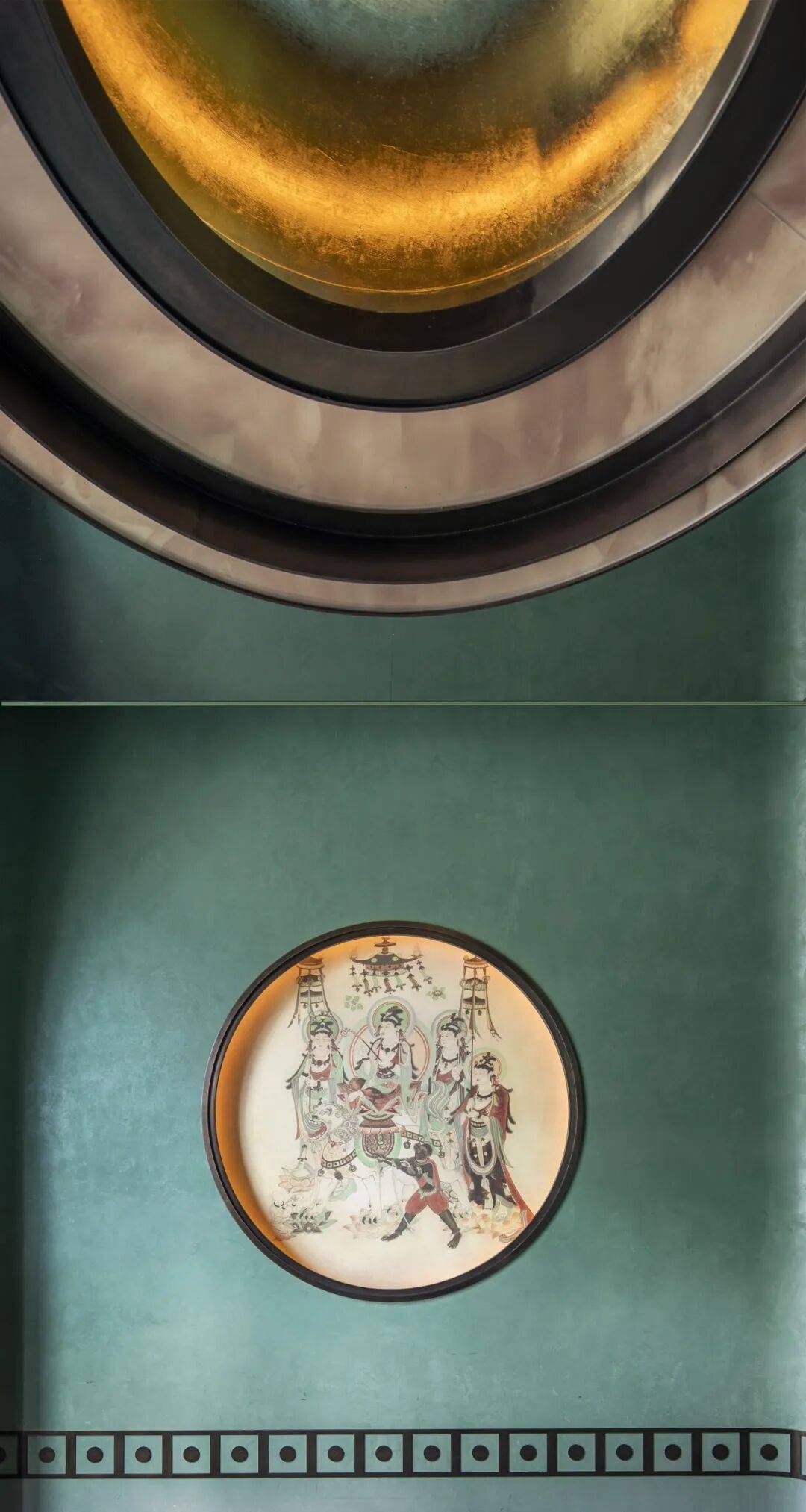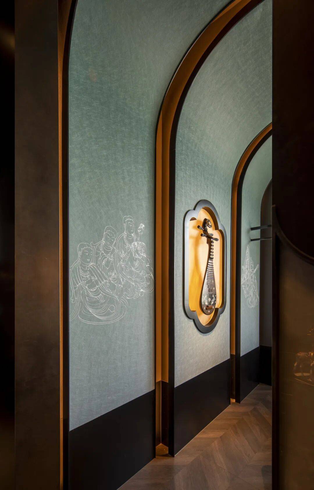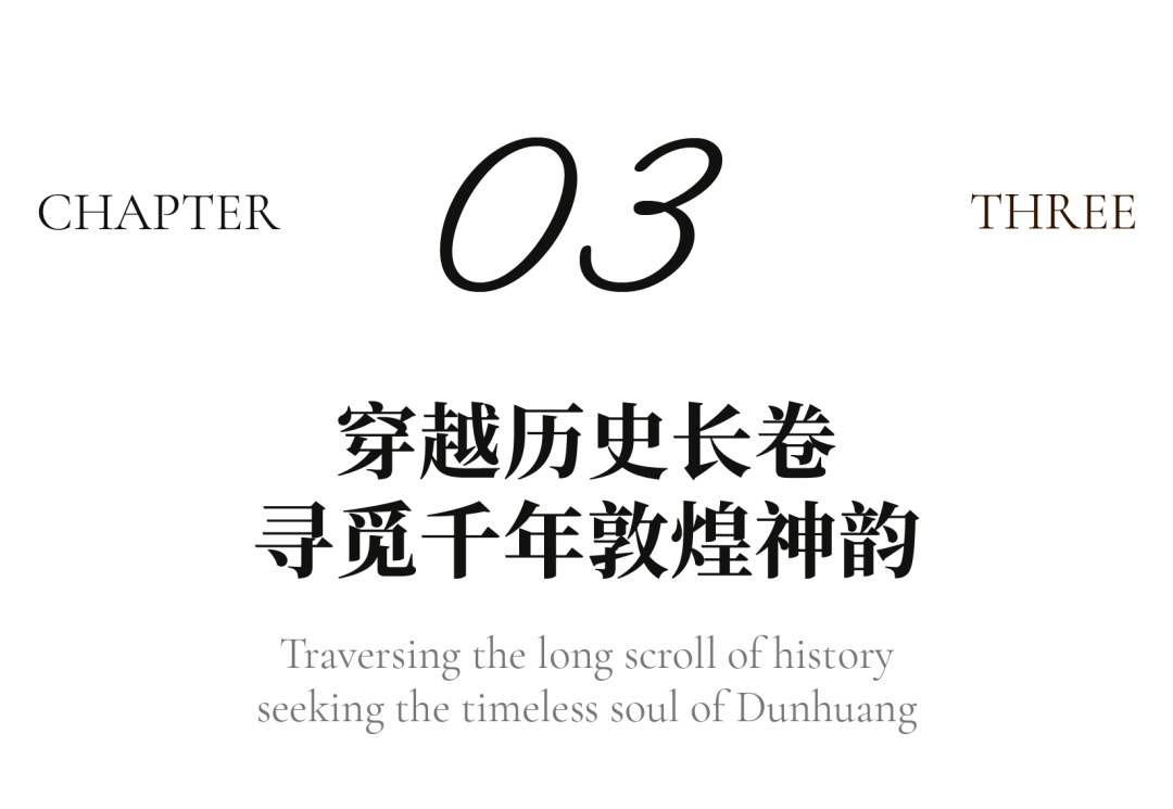 文化脉络的串联:餐厅以敦煌文化为脉络,撷取代表性石窟壁画为灵感,将胡杨翠影、丹青千壁等元素融入空间之中。从入口处鎏金饰纹精琢的敦煌飞天排列两侧,到廊道纵深渐次延展构成的庄严而流动的空间叙事,宾客仿佛一踏入便坠入千年前的金色梦境,开启了一场穿越时空的文化之旅。