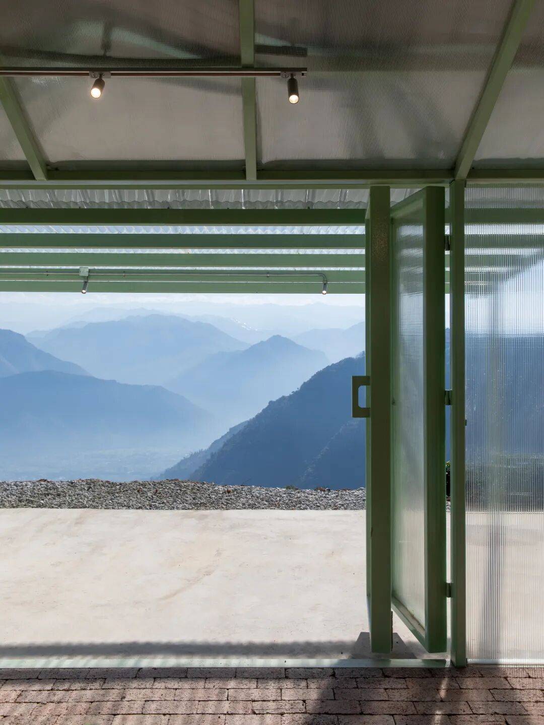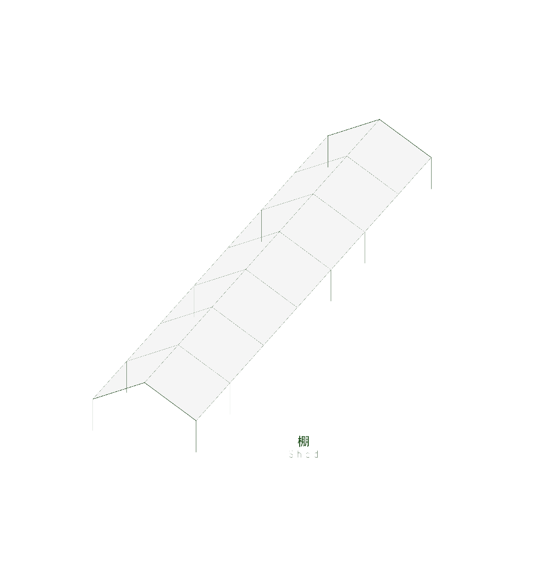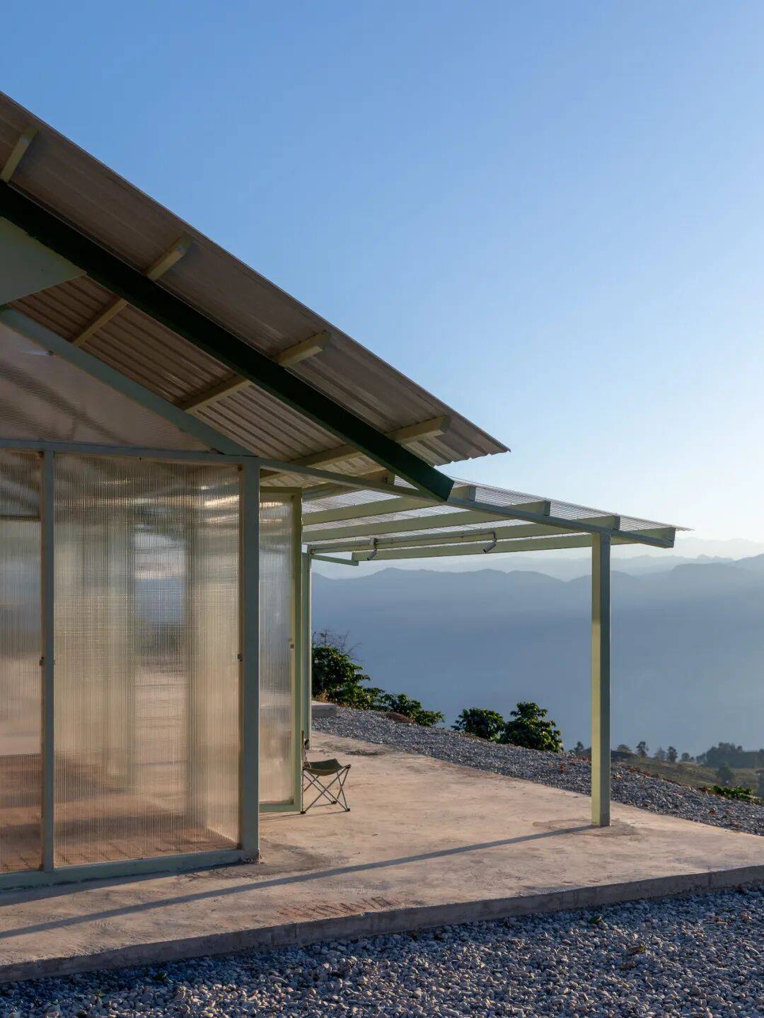 绿色的层次表达:绿是高黎贡山的整体颜色,代表着强烈的生命力。设计中运用了不同层次的绿色:浅绿色代表植物的新生嫩芽,涂抹在檩条、三角钢板和操作区小屋构架上,在不同时段的不同光影下可以弱化面和体,带来一种构架的轻盈感;深绿色是植物的躯干,涂抹柱与梁,强调构架的稳定与向上感;墨绿色是根,涂抹在柱子的底部,扎根并与大地相连。这种色彩运用不仅增强了晒场与自然的联系,还赋予了空间丰富的情感内涵。