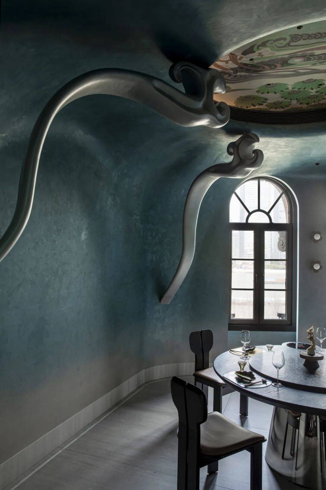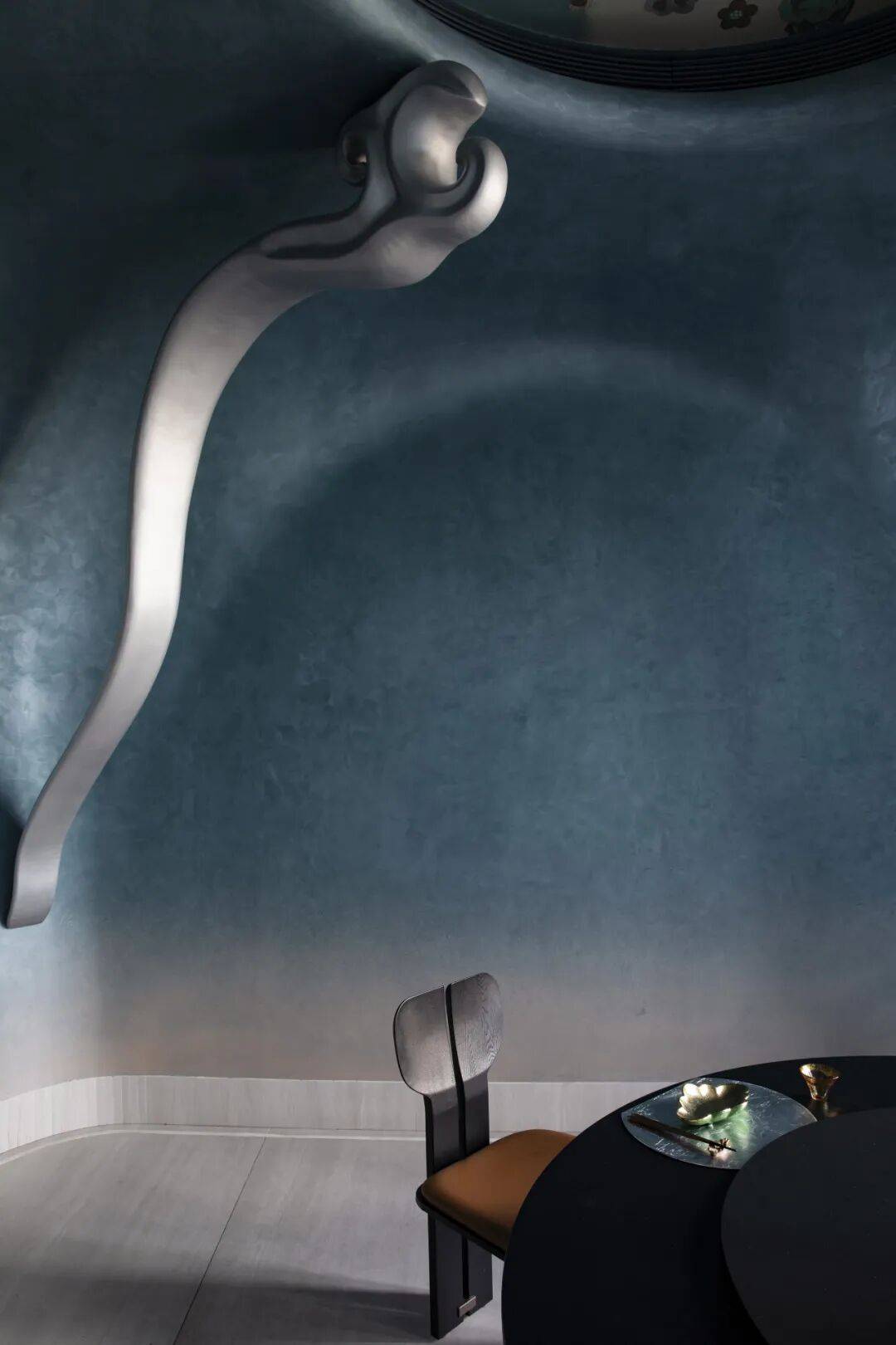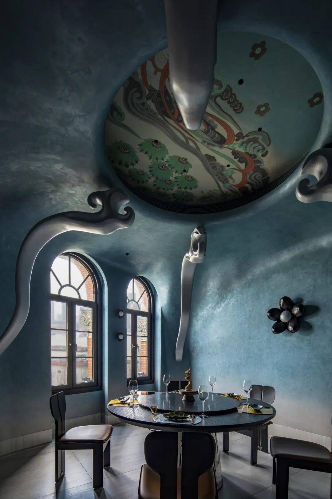 《大唐四飞天》主题包间:以壁画中飘逸灵动的飞天形象为灵感,银色祥云元素以现代材质演绎,蜿蜒而上,续写敦煌的浪漫想象,使宾客仿佛置身于大唐盛世的梦幻天空之中。