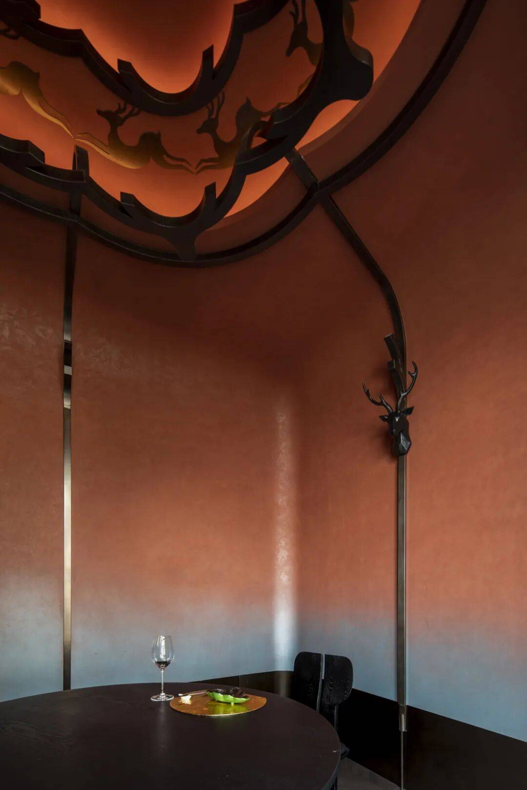 《鹿王本生图》主题包间:从壁画中凝练灵鹿的神韵,将其形态抽象化为空间顶部的艺术造型。设计以开放包容的姿态,融汇古印度神话的叙事底蕴与东方美学的含蓄表达,营造出意境深远的文化体验场景。