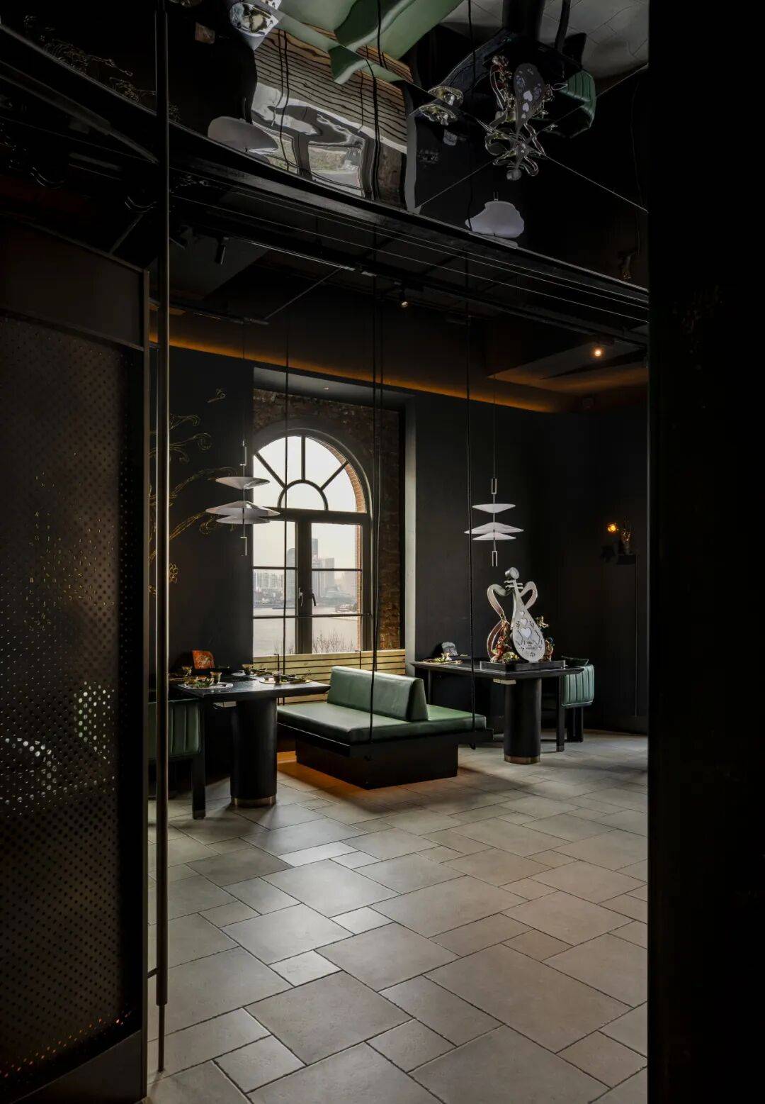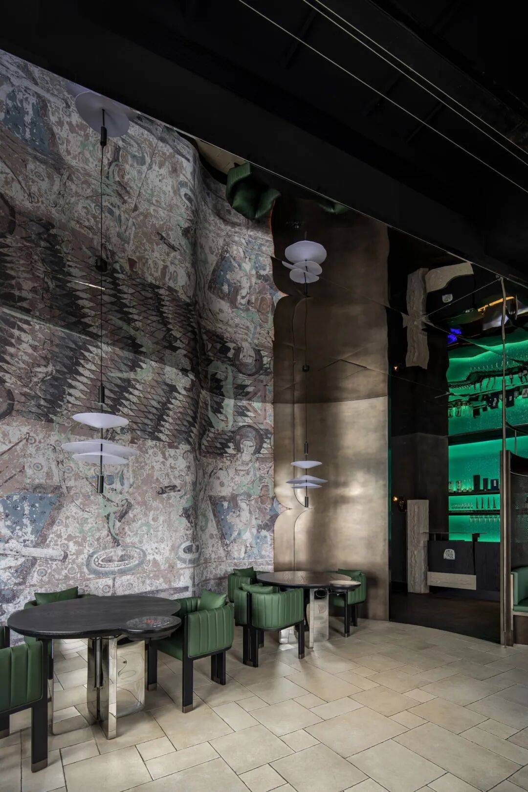 艺术与空间的融合:敦煌壁画这部千年的视觉史诗在餐厅空间中绵延,丝路文明在墙体间交汇。吧台背景墙宛若沙漠中的一处绿洲,带来生机与慰藉;空间中流转的优雅弧线,轻柔过渡着每一处转折,宛如历史与未来在此重叠低语。各朝美学风格凝为不同空间的呼吸韵律,让每一次驻足都成为穿越艺术长卷的沉浸体验。