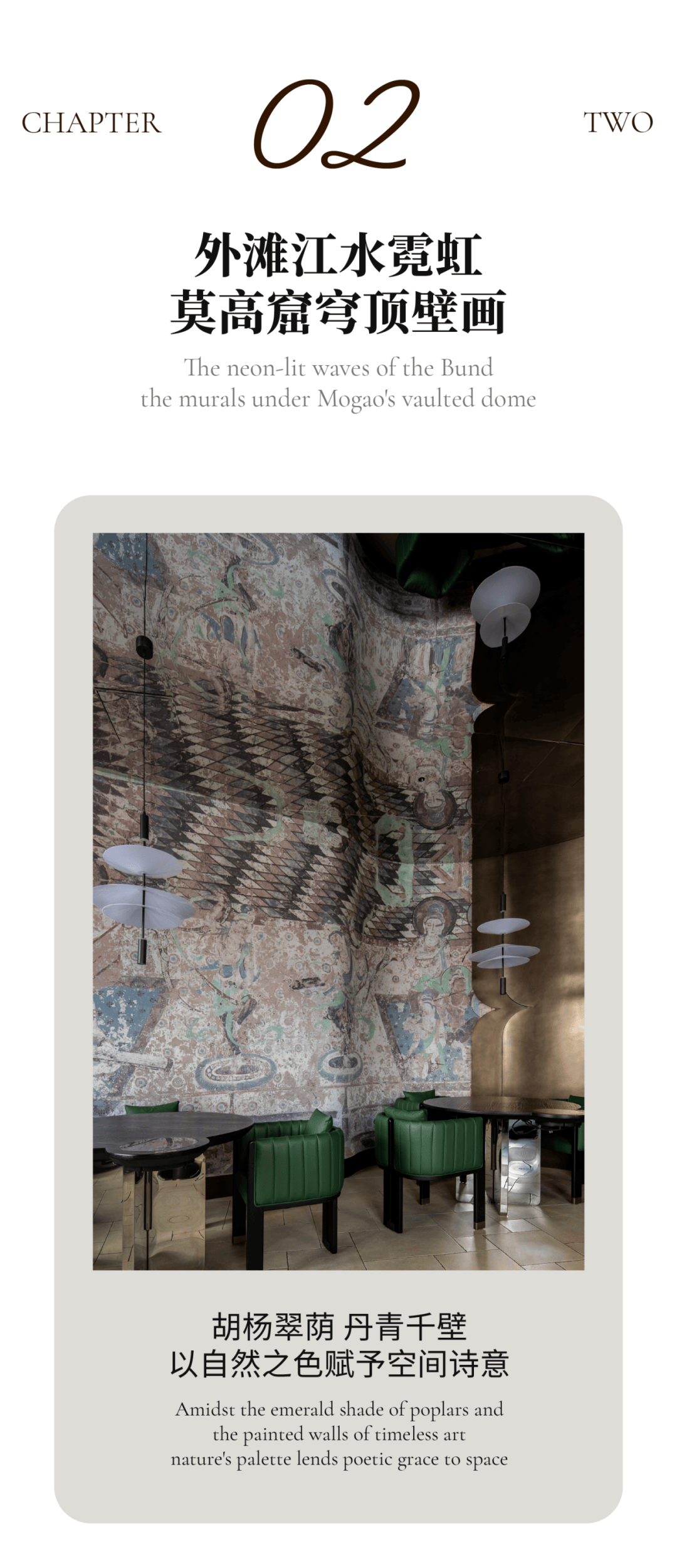 在当今多元化的设计浪潮中,如何将传统文化与现代设计巧妙融合,创造出既富有历史底蕴又符合当代审美与功能需求的空间,成为了设计师们不断探索的重要课题。上海敦煌神画餐厅和云南山野咖啡晒场,这两个分别位于繁华都市和宁静山野的项目,虽在设计风格、功能定位和文化背景上存在显著差异,但都以独特的方式展现了传统与现代的精彩交织,为我们带来了丰富的设计启示。