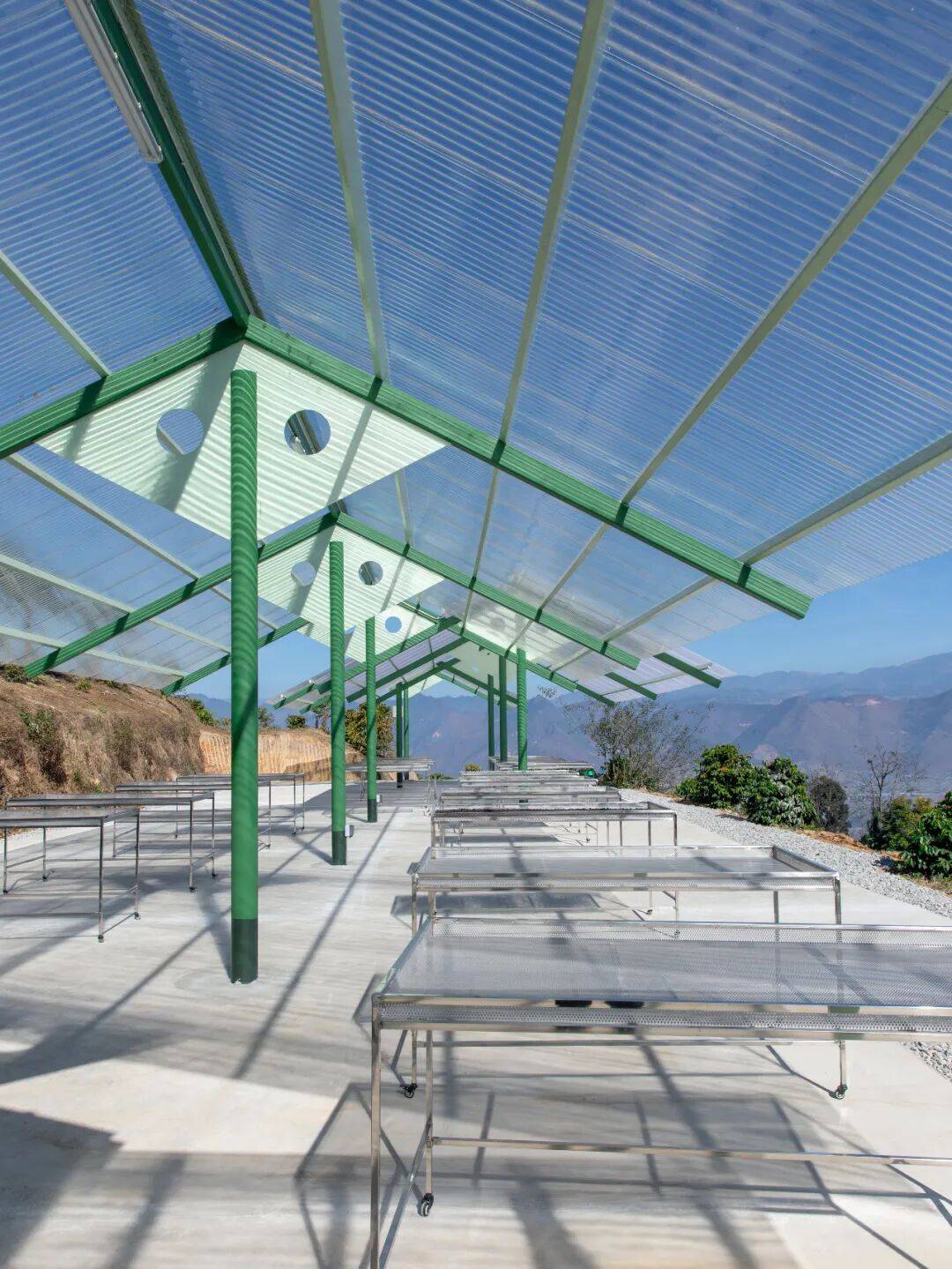 体块的错落处理:为弱化棚架的体量感,更加接近于周边的小体量传统建筑,将晒场整体构架分为四大段,相互进退形成有秩序的错落状。这种设计让晒场棚架更像高山上的咖啡驿站或车站,既满足了功能需求,又与周边环境相协调。
