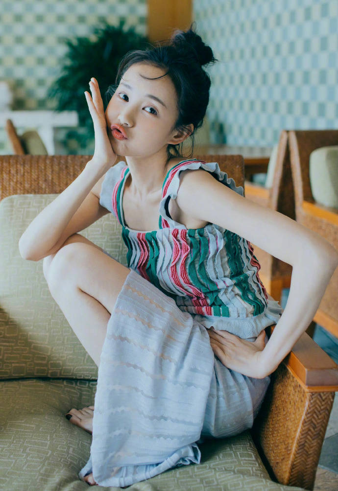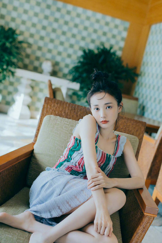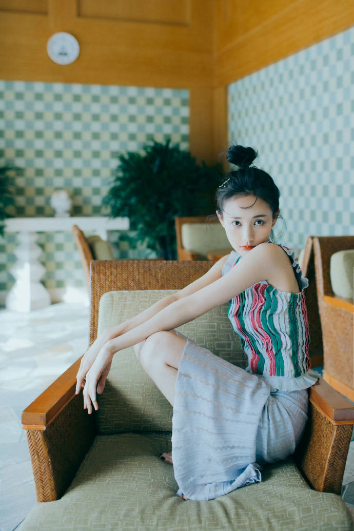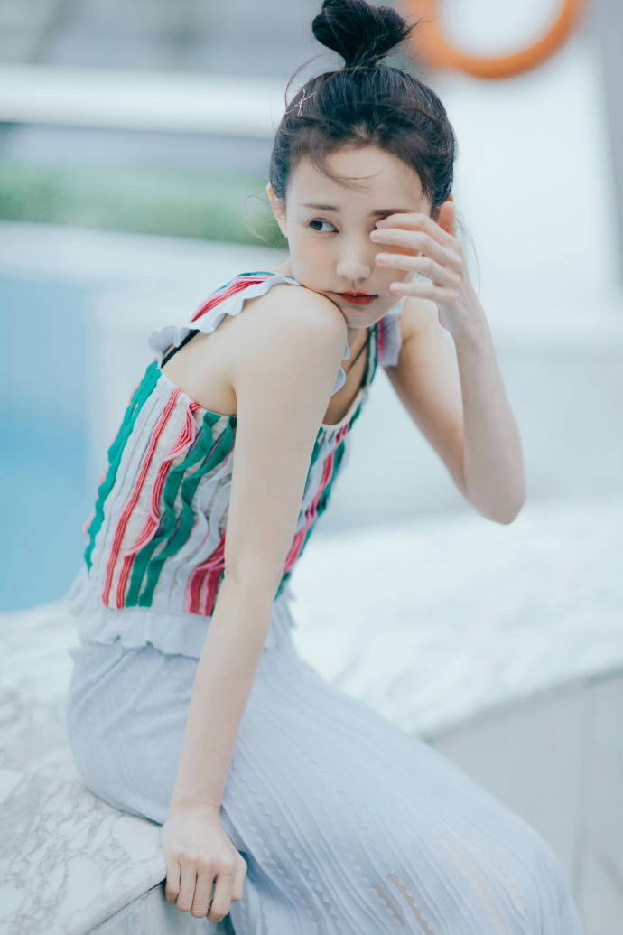 摄影师绝对是懂行的!故意用极简背景突出她:大理石材质的台面冷感十足,她穿灰白横纹裙盘腿坐着,忧郁眼神穿透屏幕;换个场景,浅蓝条纹裙配黄绿拼贴墙,藤椅圆钟当陪衬,她蜷在沙发里像杯慵懒的拿铁。最惊艳的是泳池边那张——彩色吊带背心随风扬起,浅灰纱裙飘成仙女裙摆,背后高楼虚化成水墨画,她站在大理石台上仿佛踏浪而来。这种“背景越空,主角越炸”的构图,把她的气质焊死在C位!