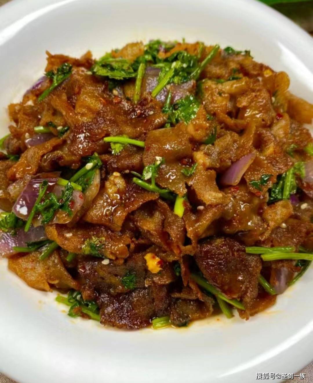 2. 待肥牛出水后倒掉汤汁继续煸炒