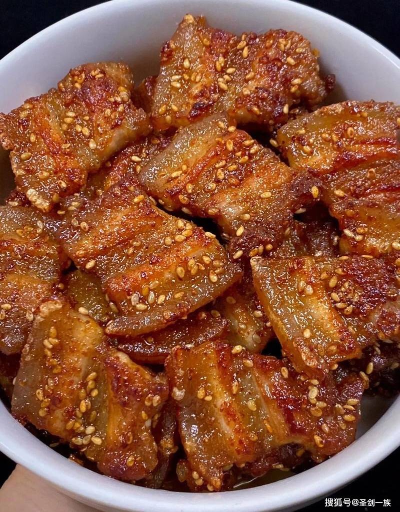 2. 香煎五花肉:五花肉经过腌制后,煎至两面微黄,油脂煎出,使得五花肉的口感更加香醇而不腻。加入蒜末和烧烤料翻炒,使得五花肉的风味更加丰富,最后撒上白芝麻和葱花,增加了菜品的色泽和香气。