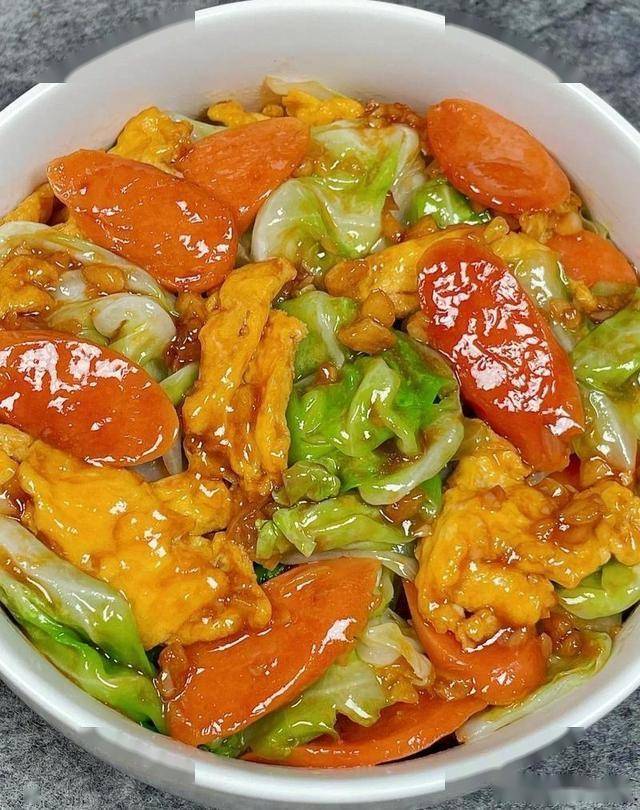 4. 淋入调好的酱汁,快速翻炒至包菜变软即可出锅。