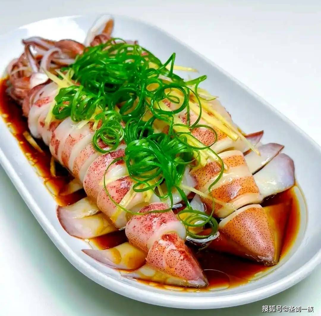 3. 淋油激香:将焯好的鱿鱼整齐码放在盘中,上面铺上新鲜的葱丝和姜丝。淋上两到三勺蒸鱼豉油。最后,烧一勺滚烫的热油,均匀地浇在葱姜丝上,“滋啦”一声,香气扑鼻!