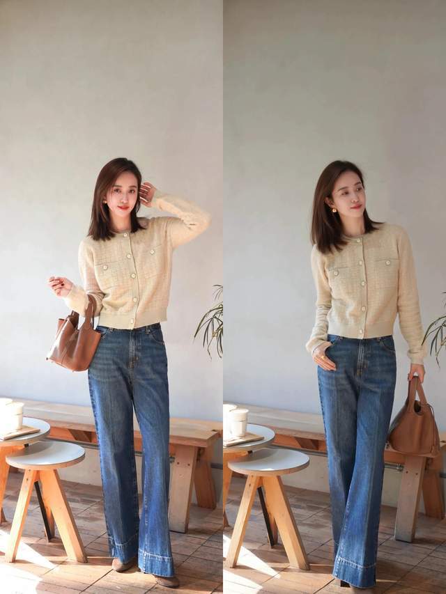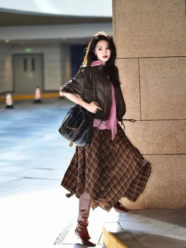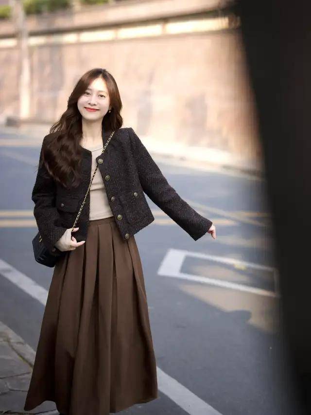 想让自己的打扮更精致经典耐看,我们确实可以选择一件黑色的小香风外套内搭杏色的打底衫,加上一条棕色的压褶伞状半身裙,上短下长的搭配就能使得小个子女生显高显瘦,而且这样的穿搭精致又耐看。第三章节,职场女性裙装穿搭