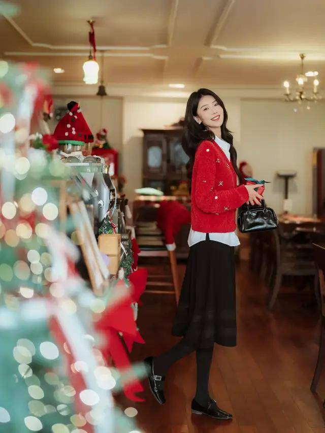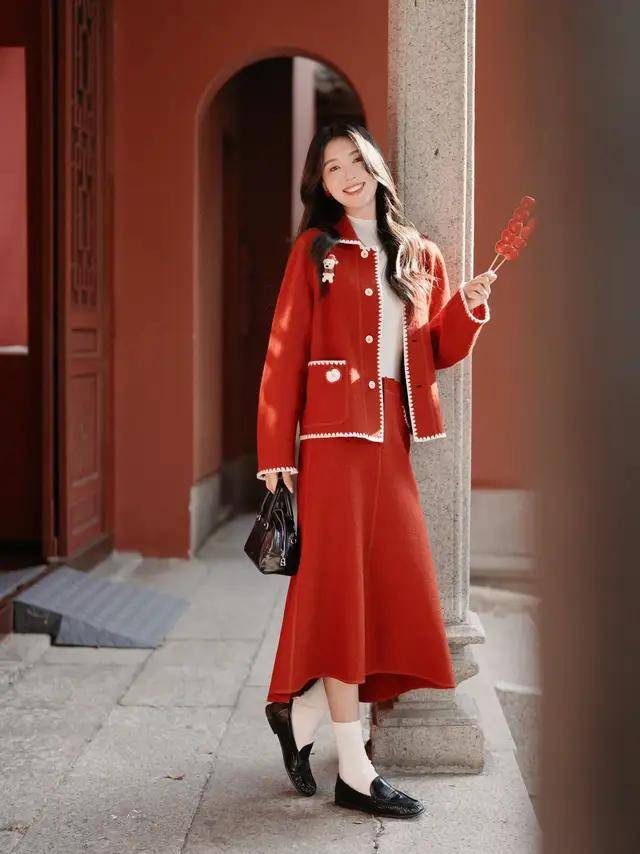 例如上面这一套红色的小香风裙装,就用了白色的毛衣,白色的袜子,黑色乐福鞋,黑色手提包来点缀,让整体配色变得更协调,同时活力感拉满。过年过节去走亲戚这样穿,谁见你都夸你一声真漂亮。