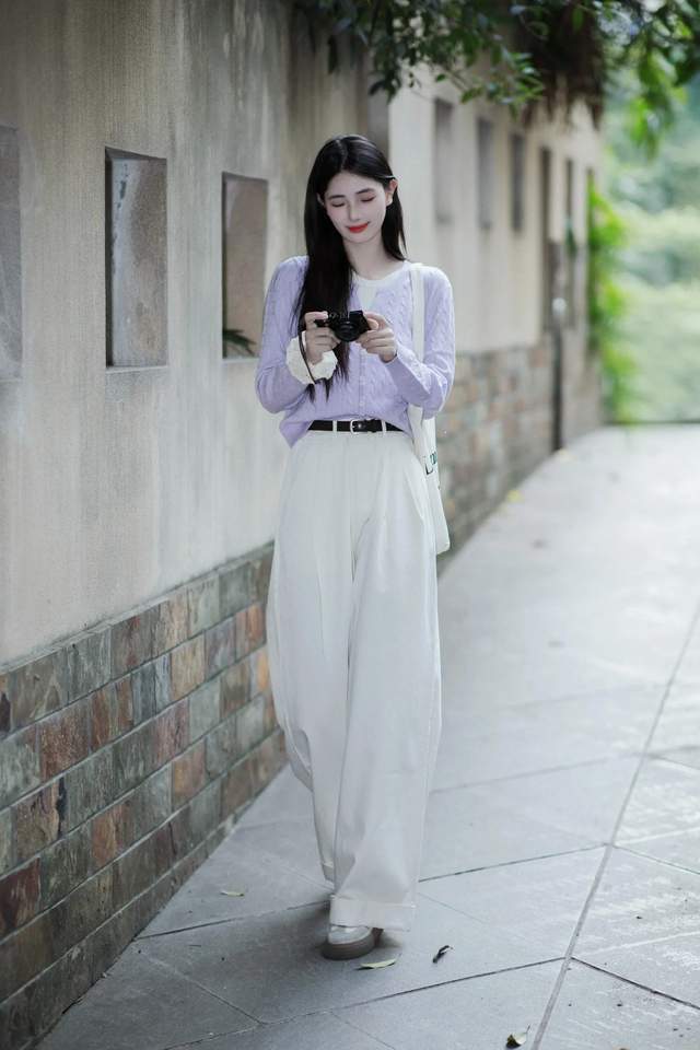 有的时候我们穿衣打扮不必刻意装嫩,我们可以直接选择一件紫色的针织开衫,内搭白色打底衫,加上一条白色的伞状半身裙,这样的色彩搭配能使得穿搭者很好地修饰肤色,显白显嫩,年轻姿态自显,能够使得穿搭者美如初恋女友一般。