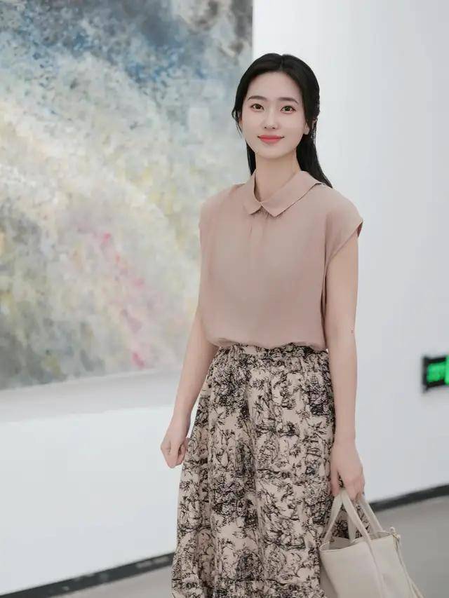穿纯色的衣服觉得单调的情况下,我们可以用纯色的衬衫搭配上印花的半身裙,繁简结合的穿搭技巧就能增加造型的精致感和时尚感。