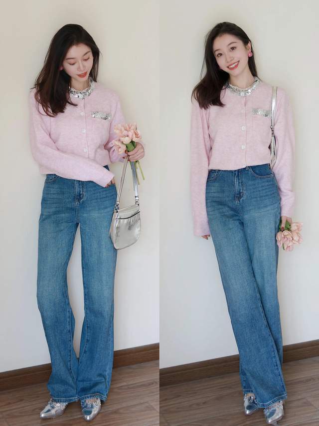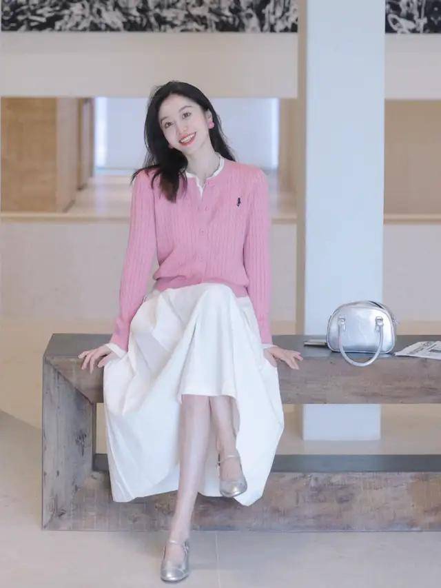 Tips④:粉色针织开衫搭配白色半身裙