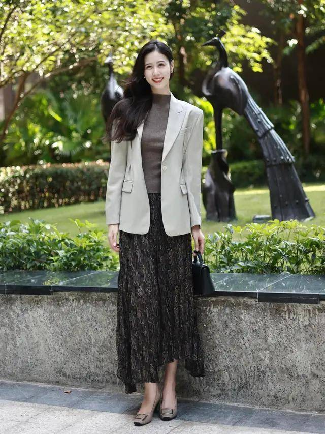 可以用针织毛衣搭配散装半身裙,温柔大方也可以选择西装外套搭配上长裙,优雅干练,轻松穿出上短下长的黄金比例,小个子也能驾驭,从通勤到出游都美得恰到好处。