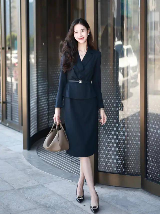 如果过完年之后回归职场的上班,我们肯定会要考虑自己穿什么样的衣服会更好看,推荐你可以选择像上面这种黑色的西服裙装,穿在身上之后很修饰身材,能让你拥有流畅利落的身材比例,脚上穿了一双黑色的浅口单鞋,适当的把小腿肌肤展露出来,这样看起来更灵动。