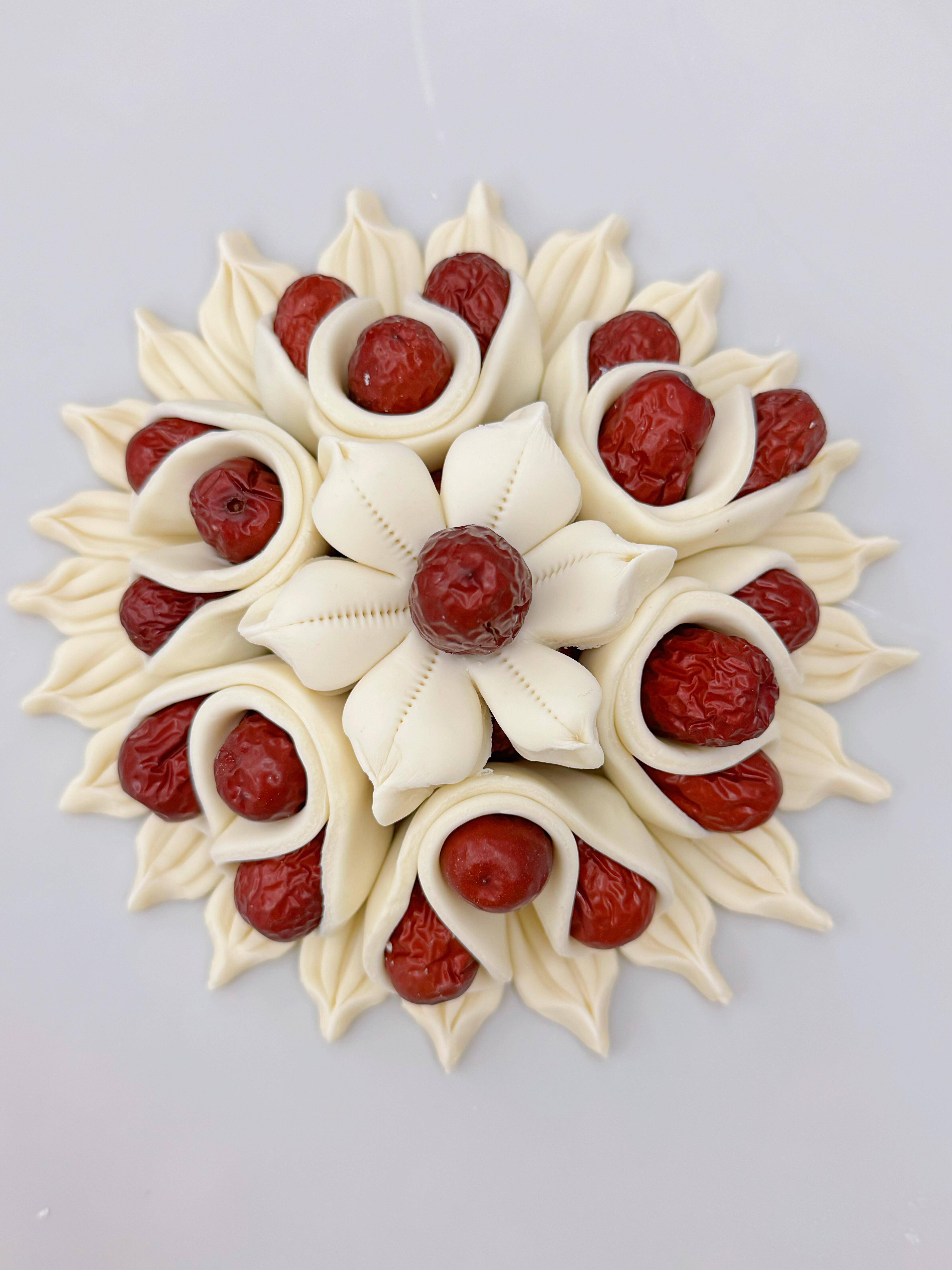 • 做法:圆片上下捏成“元宝”状,三个摆一起用筷子压合,每瓣中间放红枣,捏出尖,蒸好像个大蝴蝶结,过年送礼超有面!进阶技巧:想更精致?用梳子压出花纹,秒变“非遗”同款~